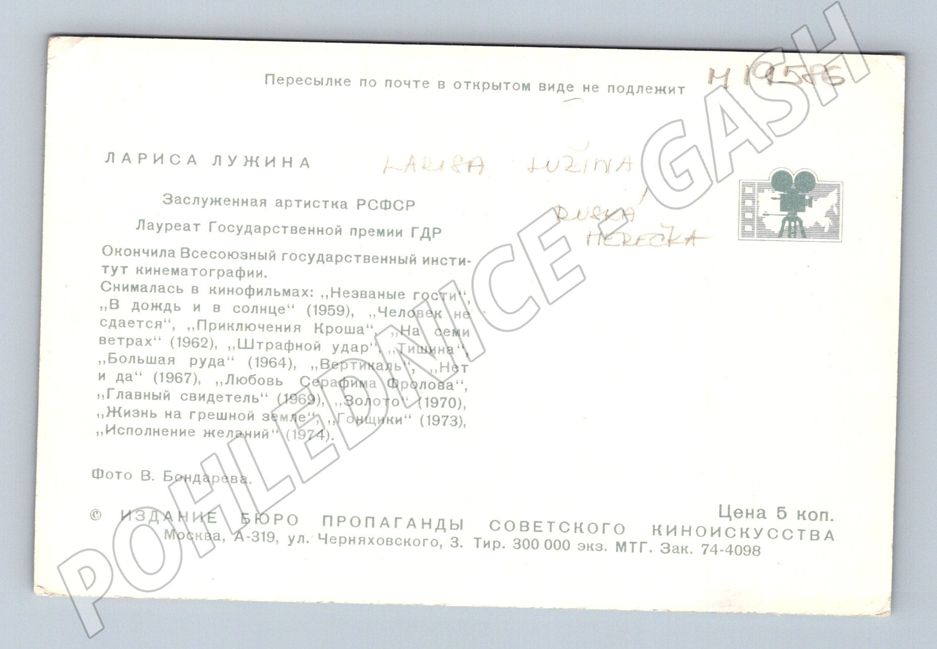 Originální sovětská pohlednice s portrétem herečky Larisy Lužiny. Na zadní straně pohlednice naleznete stručný životopis herečky v ruštině, včetně výčtu významných filmových rolí a ocenění (zasloužilá umělkyně RSFSR, laureátka státní ceny). Pohlednice byla vydána Biurem propagandy sovětského kinematografického umění v Moskvě. Foto: V. Bondarev. Cena 5 kopějek. Rozměr klasický pohlednicový, tisk cca 70. léta 20. století. Stav: velmi dobrý, drobné známky opotřebení odpovídající stáří, viz foto. Vhodné pro sběratele pohlednic s filmovou tematikou i milovníky sovětského filmu.