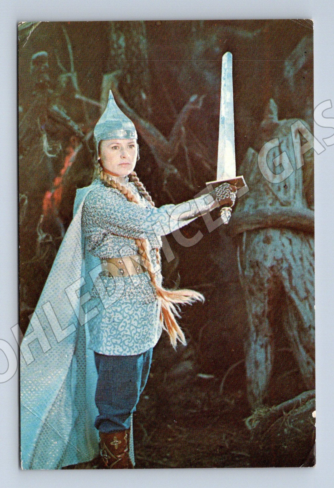 Originální sovětská pohlednice ze 70. let s filmovým motivem z filmu Zlaté rohy (ruský název Золотые рога), režírovaného A. Rouem. Pohlednice zobrazuje postavu Jevdokije (herečka R. Rjazanova) v kostýmu s mečem, zachycenou ve scéně z filmu. Na zadní straně jsou uvedeny informace o filmu i o hereckém obsazení. Vydání: BYURO PROPAGANDY SOVETSKOGO KINOISKUSSTVA, Moskva. Cena 5 kopějek. Pohlednice je vhodná pro sběratele filmových pohlednic a fanoušky sovětské kinematografie. Stav viz foto, lehce opotřebovaná.