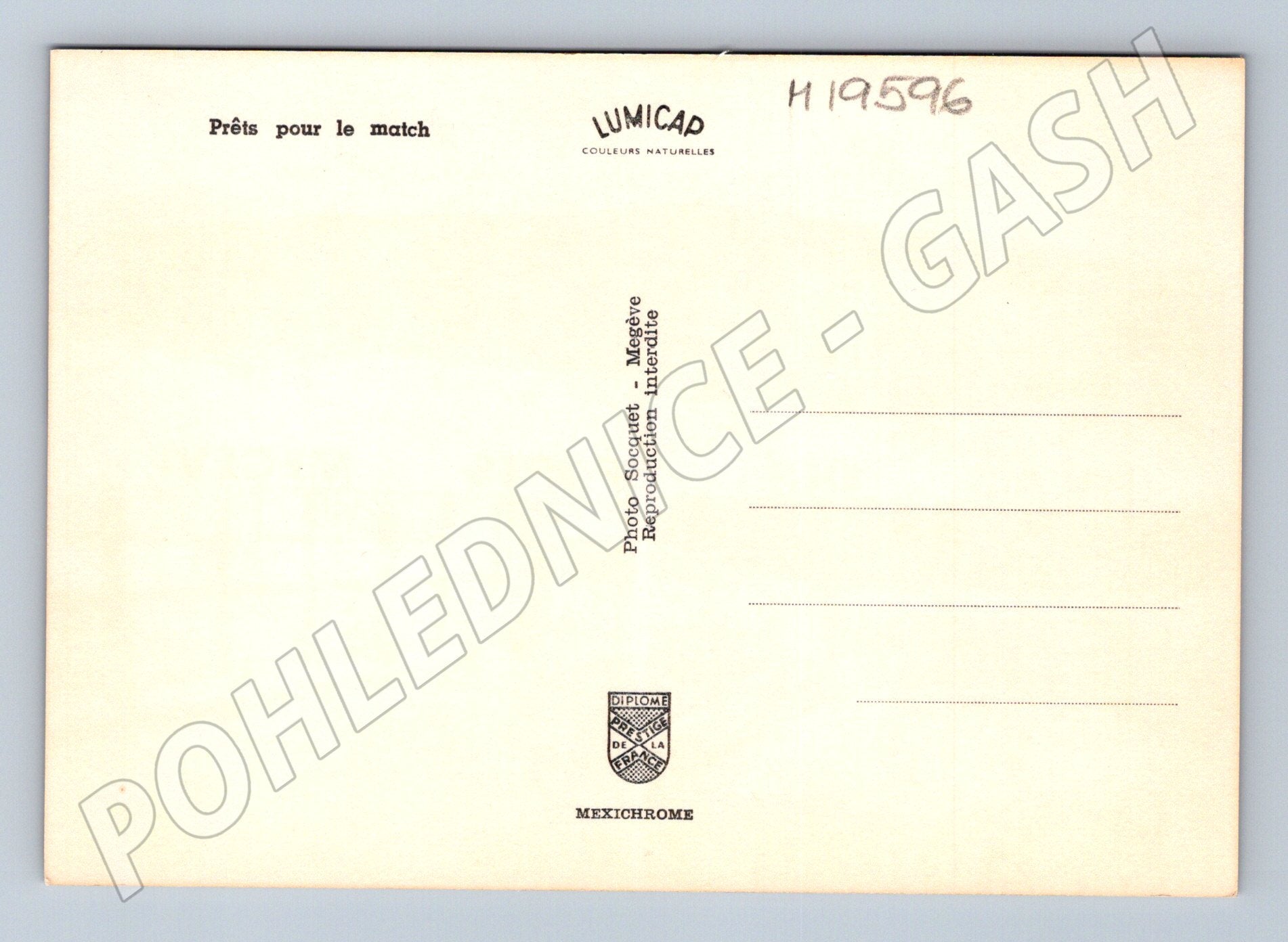 Originální pohlednice s týmem ledního hokeje C.S. Megève. Pohlednice zachycuje hráče v červeno-bílých dresech s nápisem MEGEVE na stadionu těsně před začátkem zápasu. Na zadní straně pohlednice je francouzský nápis Prêts pour le match (Připraveni na zápas), výrobce Lumicad a poznámka Photo Socquet - Megève . Výborný sběratelský kousek pro milovníky sportovních pohlednic a fanoušky hokeje. Stav dle scanů.