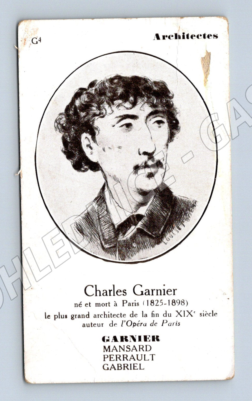 Originální stará pohlednice s portrétem významného architekta Charlese Garniera (1825–1898), známého především jako autora slavné budovy pařížské Opery. Pohlednice obsahuje charakteristickou kresbu hlavy a základní informace o Garnierovi včetně seznamu dalších významných architektů (Mansard, Perrault, Gabriel). Text je ve francouzštině, vhodné pro sběratele historických pohlednic s tématikou umění, architektury a významných osobností. Pohlednice má viditelné stáří a patinu, rubová strana je prázdná a zelená, bez textu či adresy. Místy opotřebení na okrajích.