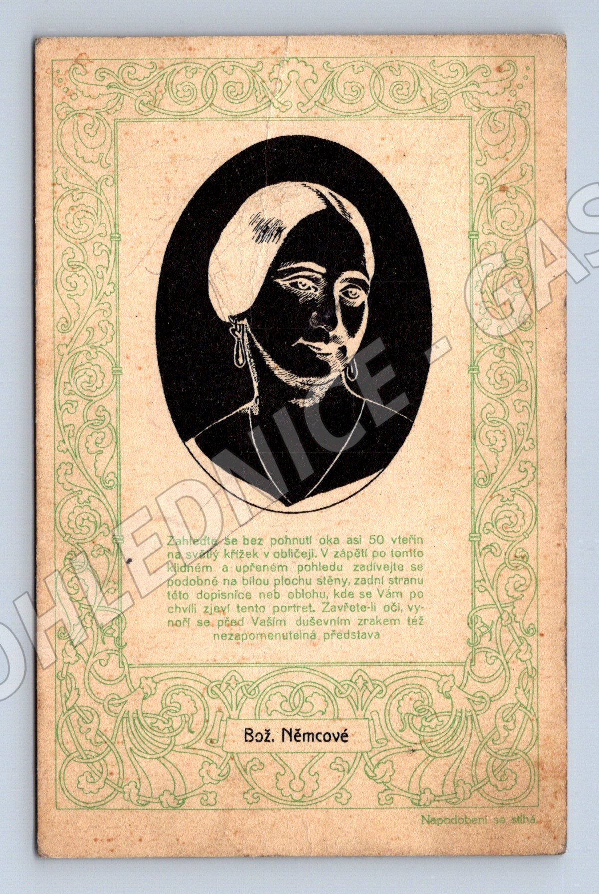 Starší pohlednice s portrétem a jménem Boženy Němcové, významné české spisovatelky. Pohlednice je vyzdobena stylizovaným zeleným rámečkem a barevným portrétem. Vedle obrázku se nachází krátký text na počest autorky. Na zadní straně jsou patrné stopy stáří, zažloutnutí, menší skvrny a drobné opotřebení. Pohlednice není vyplněná, bez známky a razítka. Vhodné jako sběratelský kousek nebo pro milovníky literární historie.
