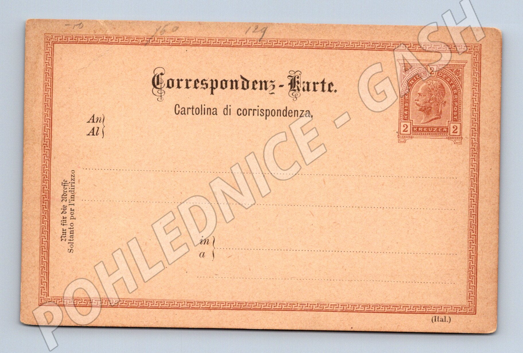Originální stará rakouská korespondenční karta s hodnotou 2 Kreuzer. Pohlednice je v perfektním sběratelském stavu, nepoužitá, s jasným tiskem a krásným vzhledem. Text na pohlednici je v němčině a italštině (Correspondentz-Karte / Cartolina di corrispondenza), což nasvědčuje, že pochází z období Rakousko-Uherska a pravděpodobně byla určena pro užití v oblasti s italsky mluvícím obyvatelstvem. Vhodné pro sběratele starých pohlednic nebo historických poštovních materiálů. Rozměr klasický malý formát, zadní strana čistá, bez zápisu.