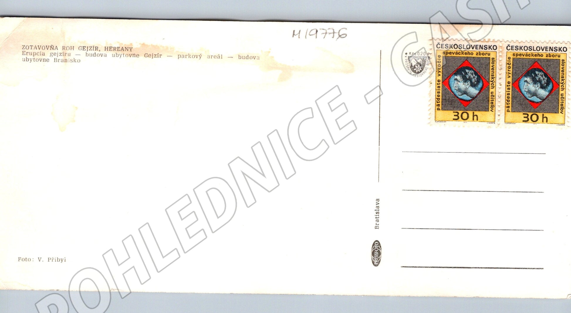 Originální černobílá pohlednice zobrazující zotavovnu ROH Gejzír v Herľanech (dnes Slovensko). Na přední straně pohlednice jsou koláže snímků s gejzírem, budovou zotavovny a parkovým areálem. Pohlednice je opatřena dvěma známkami a je nepopsaná, což zvyšuje její sběratelskou hodnotu. Fotografii pořídil V. Přibyl. Atraktivní motiv vhodný do sbírky historických pohlednic z území Slovenska, zejména se zaměřením na rekreační a lázeňská místa.