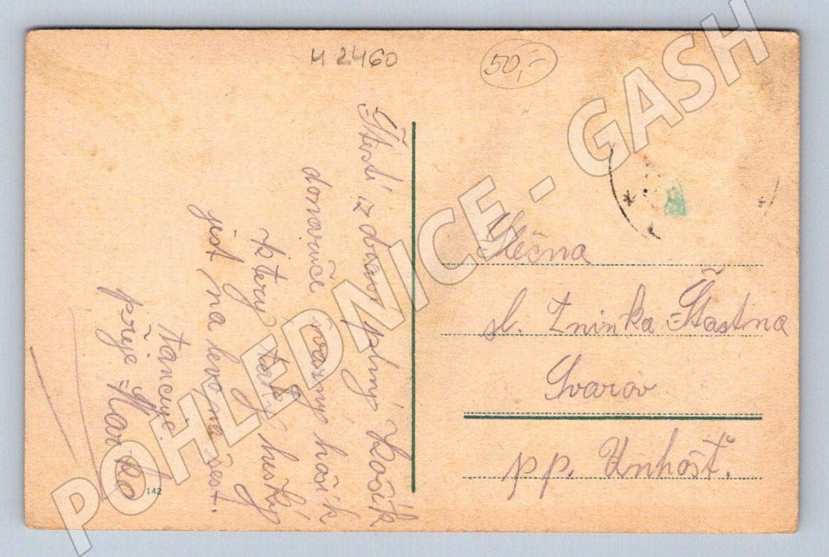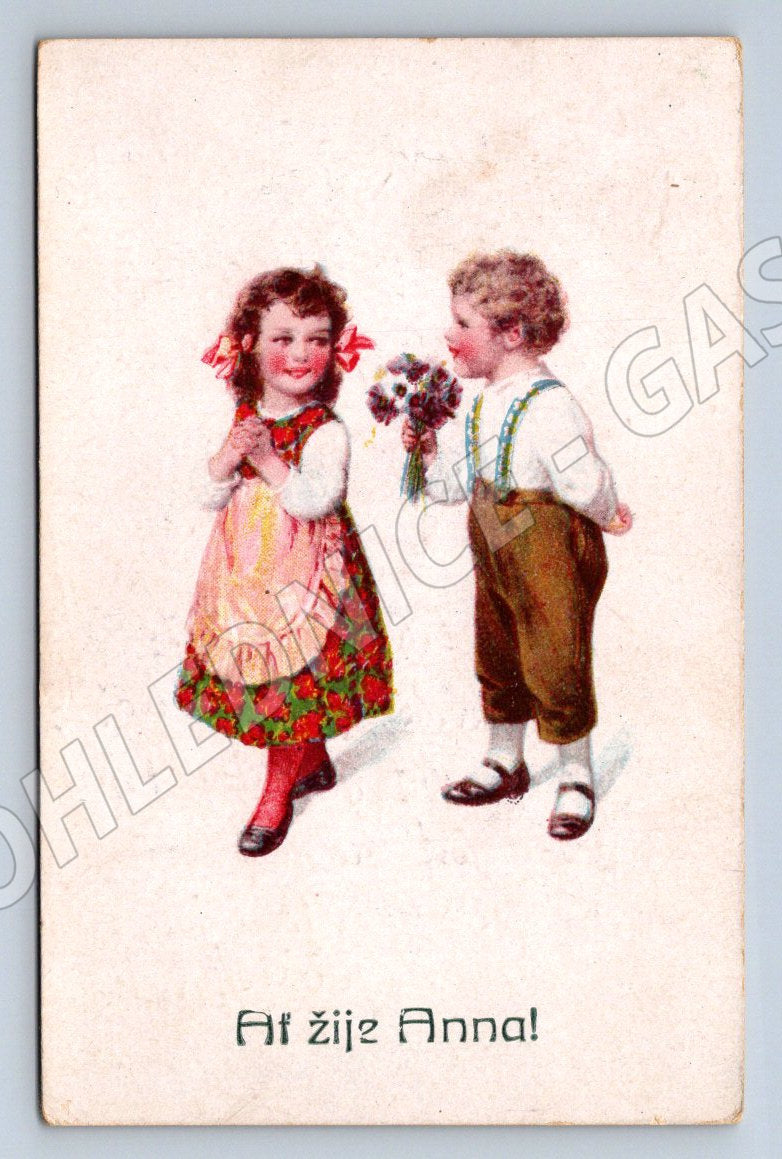 An older postcard titled Long Live Anna! depicts an illustration of two young children in traditional folk costume. The girl is wearing a flowered skirt with a front apron, the boy is holding a bouquet of flowers. The postcard bears a handwritten message with a dedication and address, indicating its authentic and collectible use. The period style of clothing and the handwritten writing add historical and cultural value to the postcard. The postcard is in good condition, with patina and slight yellowing of the paper, which underline its age.