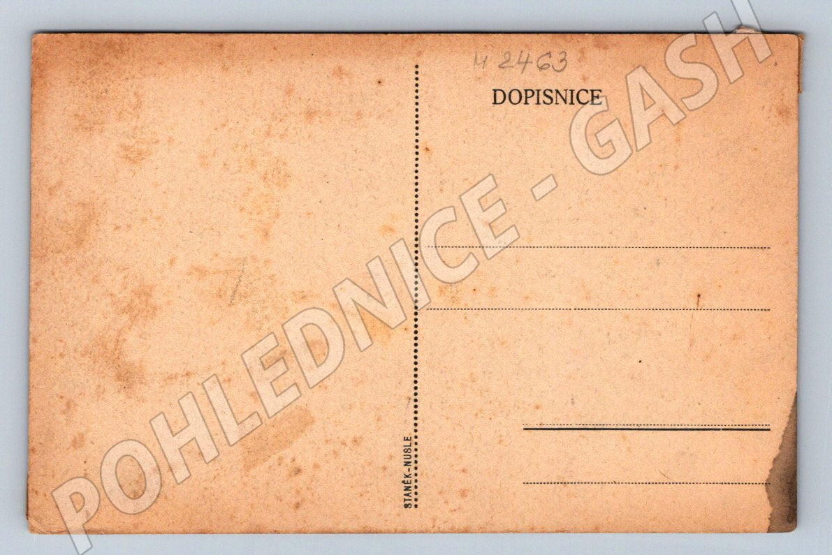 I am offering for sale an old postcard with black and white photographs of four figures in traditional costumes with the following names: Kováček, Poslušek Růžek, Marie Vírna and Louřka. The postcard dates from the first half of the 20th century, is without description or stamps, on the back with the inscription DOPISNICE and the manufacturing mark STÁNEK NUSLE. The postcard shows signs of age, such as yellowing of the paper, slight wear of the corners and sticking of paper strips on the edges. This is an interesting collector's item of an ethnographic nature, suitable for postcard collectors and those interested in folk culture.