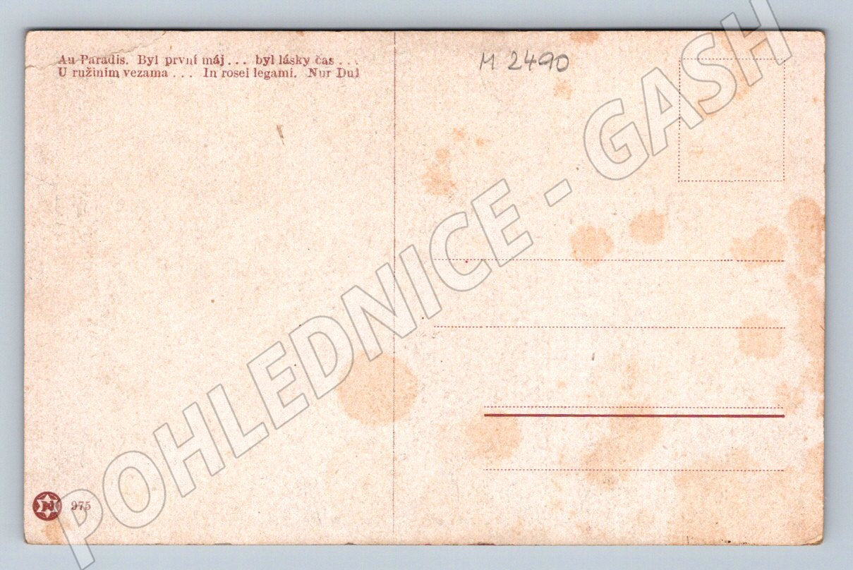 I am offering a collector's postcard with a motif of a love scene called Au Paradis. The postcard depicts a detailed, romantic image of two figures surrounded by flowers, evoking an atmosphere of love and tenderness. The title of the postcard Au Paradis is printed in the upper right corner and on the back there is printed text in several languages and an empty space for the address and letter. The postcard is in original condition with visible signs of wear, such as edge abrasions and soiling, which is characteristic of older collector's items. An ideal addition to a collection of love and artistic postcards.