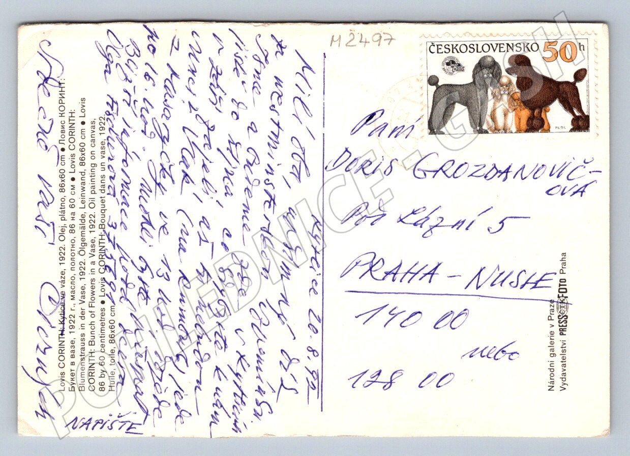 I am offering a collector's postcard depicting a reproduction of the famous painting Bouquet in a Vase by Lloys Corinth from 1922. The painting is oil on canvas, measuring 86x60 cm. The postcard is stamped with a Czechoslovakian postage stamp (50h) and is addressed to Prague. Ideal for lovers of classical art and collectors of postcards with a painting motif. The postcard is in good condition, suitable for display and other collecting activities.
