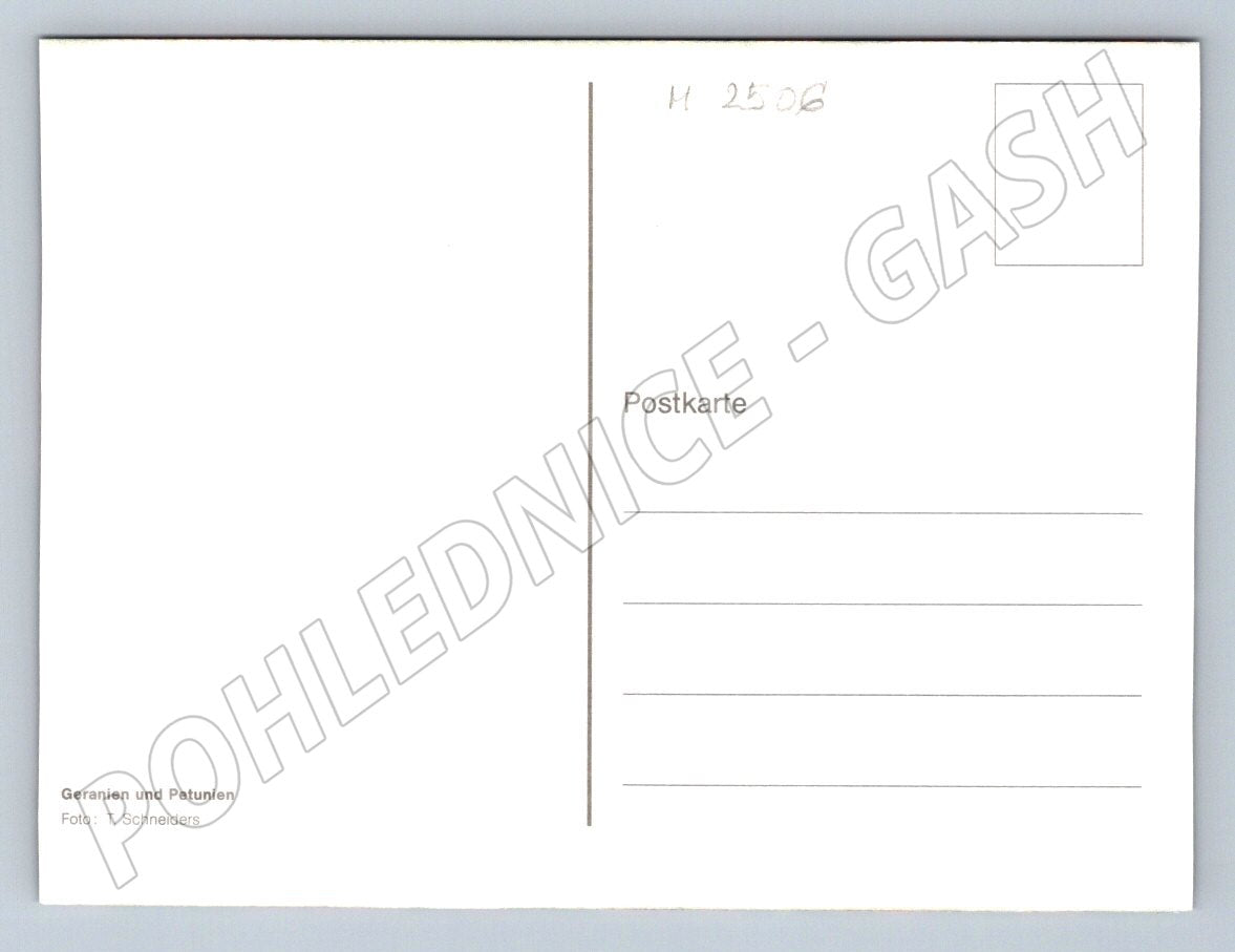 This postcard shows a beautiful composition of geraniums and petunias in various shades of red, pink and white on a dark background. The photo was taken by T. Schneiders. The postcard is intended for collectors of floral motifs and nature lovers. On the back there is space for the address and a stamp, marked Postkarte . Ideal for adding to your collection or as a decoration.