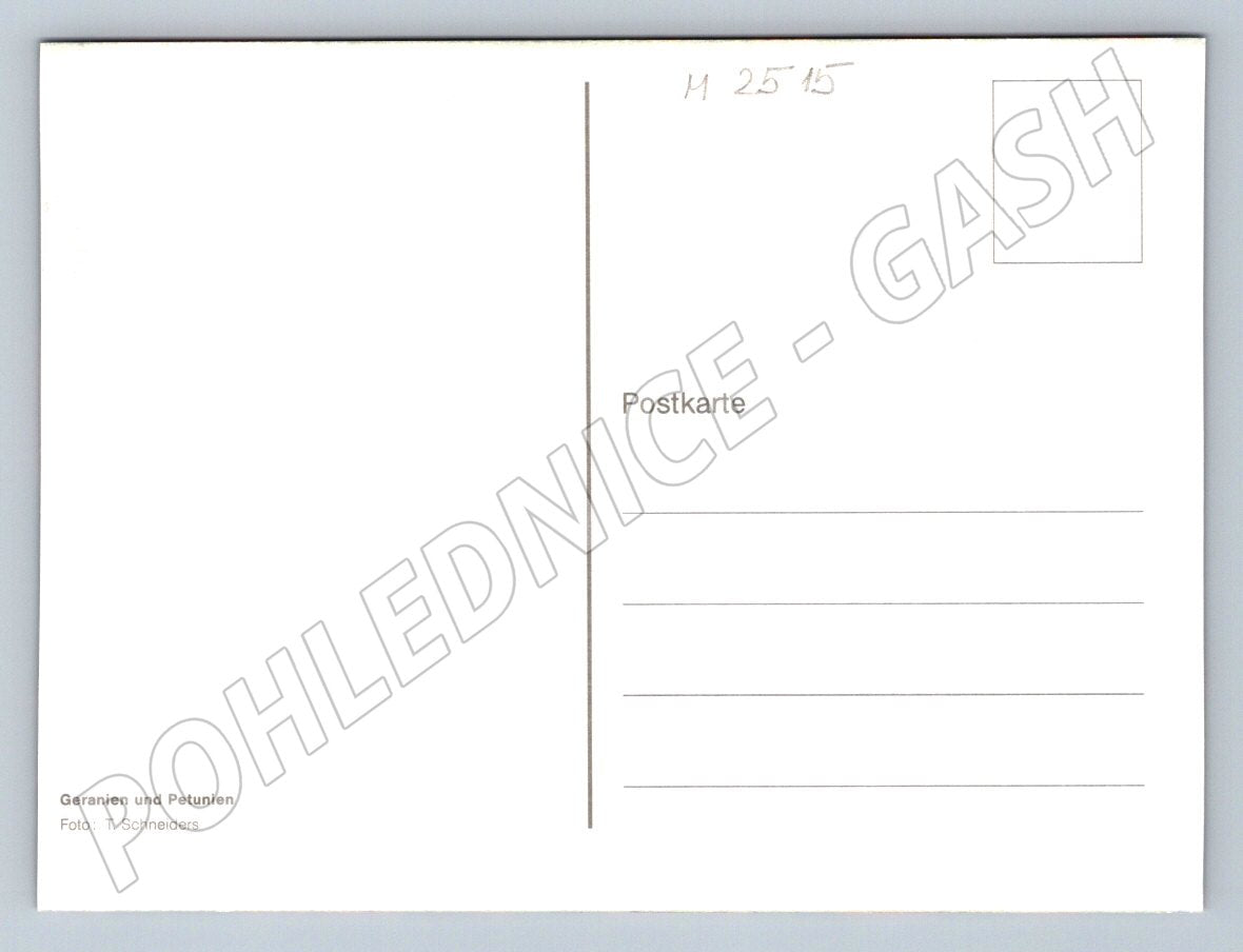 This postcard shows a colorful combination of geranium and petunias in vibrant shades of red, pink and white on a dark background. The photo was taken by T. Schneiders, as noted on the back of the postcard. The postcard is in good condition, suitable for collectors or lovers of flowers and natural aesthetics. Ideal for sending a message or as decoration.