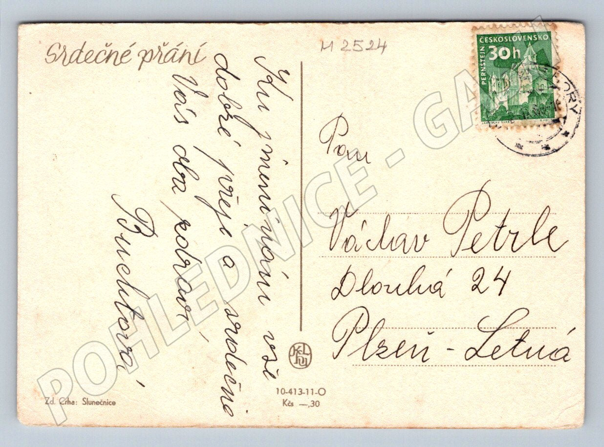 I am offering a beautiful old postcard with a sunflower motif in a watercolor style. The postcard contains a handwritten message and address including a Czechoslovakia 30h stamp depicting Pernštejn. On the back you will find a touch of old times with an authentic postmark. The postcard is suitable for collectors, lovers of vintage collections and those who appreciate painterly expression in the style of a more classic postcard. Standard dimensions, visible signs of age and use. Excellent condition with light signs of wear consistent with age.