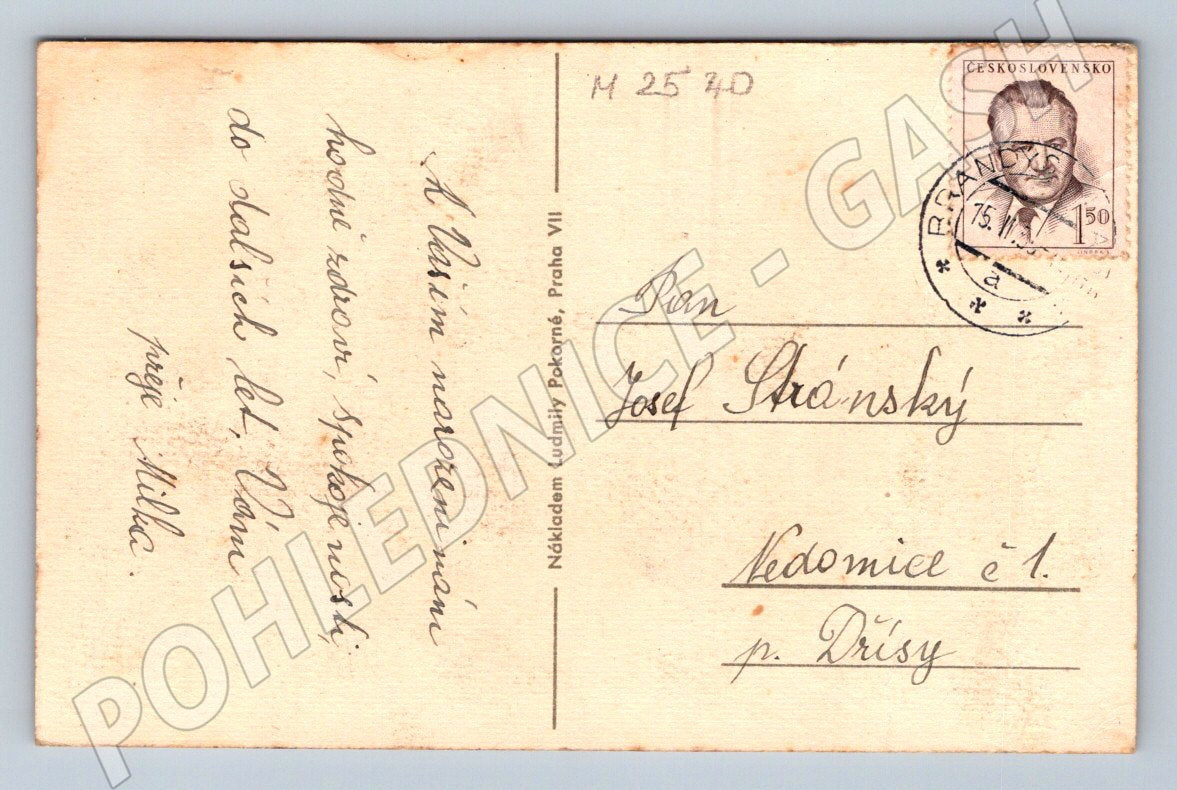 I am offering a beautiful old postcard with an illustration of a little girl in a red dress standing by an open gate. The postcard is marked with the bold inscription Heartfelt Congratulations. On the back is a written greeting addressed to Mr. Josef Sránsky in the village of Kředomice, registered with the date and the Czechoslovakia stamp with a portrait. The postcard is in slightly worn but well-preserved condition, typical of the first half of the 20th century. Ideal for adding to a collection of old postcards with ethnographic or folk themes, for collector's use or as a collector's item with a historical character.