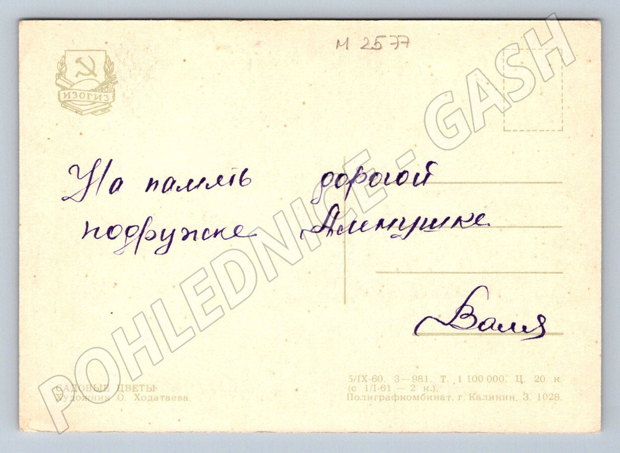 I am offering a beautiful old Soviet postcard with a motif of garden flowers - kal and pink flowers. The postcard is illustrated by the artist O. Hodatajev and dates from around 1960. On the back there is a handwritten dedication in Cyrillic and a stamp with a typical symbol of the Soviet Union. The postcard is in good condition, suitable for collectors of old postcards, those interested in Soviet graphics and floristry themes.