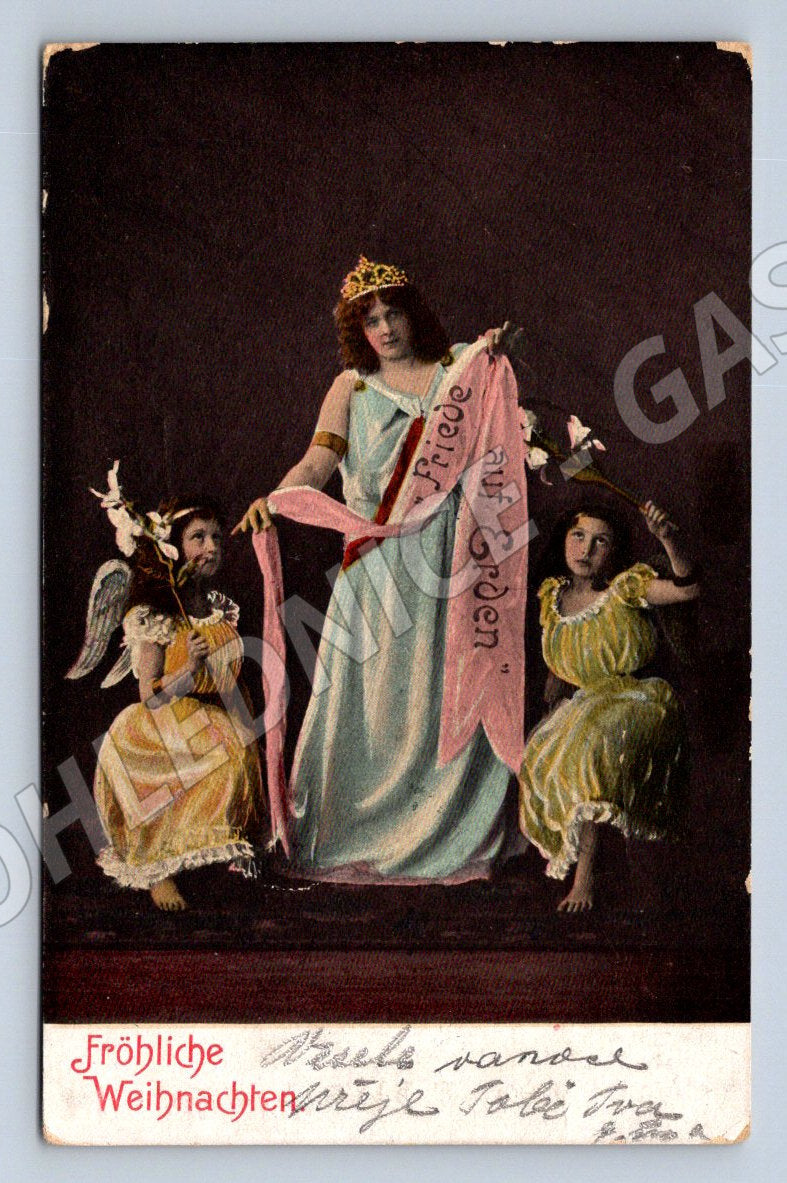 I am offering for sale an old postcard with a Christmas motif from the period up to 1950. The front side shows three figures in historical costumes, including a child angel, holding a pink ribbon with the inscription Fröhliche Weihnachten auf Erden (Merry Christmas on Earth). The postcard is stamped in 1912 and has a 5 heller stamp, sent to an address in Moravia. The postcard is in good condition considering its age, with slight signs of wear on the edges and corners. The text on the back is handwritten in German. A unique collector's item for lovers of old Christmas postcards and philatelists.