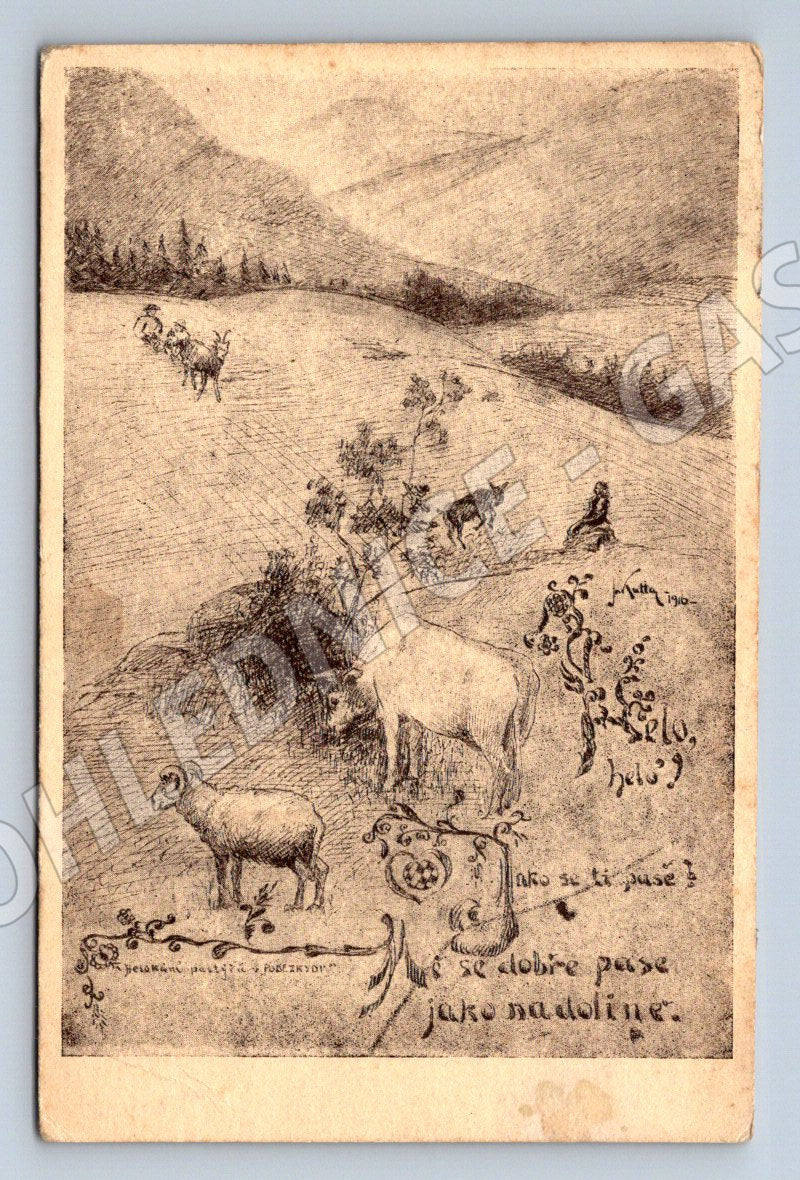 I am offering an old postcard from 1919 with the motif of Silesian shepherds' helekání, created according to a drawing by Jos. Kutta. The postcard depicts a typical landscape with grazing sheep and a plastic illustration of traditional shepherd culture in Silesia. On the back there is a noticeable stamp and handwritten address, which proves its authenticity and historical value. The postcard is published by the magazine "Beskydské Besed" Raškovice, series 3, number 1. Suitable for collectors of ethnographic documents and those interested in old Czech postcards with regional themes. II. Regiment of the Freedom Guard