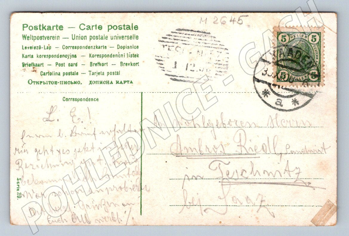 This old colorful postcard depicts a picturesque Czech chateau or castle surrounded by greenery and water. The postcard is written and has postmarks and a stamp, which indicates its authenticity and age. Due to the fine details and preserved condition, it is an ideal collector's item for history and old postcard enthusiasts. The size corresponds to the common format of postcards from the early 20th century. On the back there is a beautifully preserved text in German, which gives the postcard historical value and character.