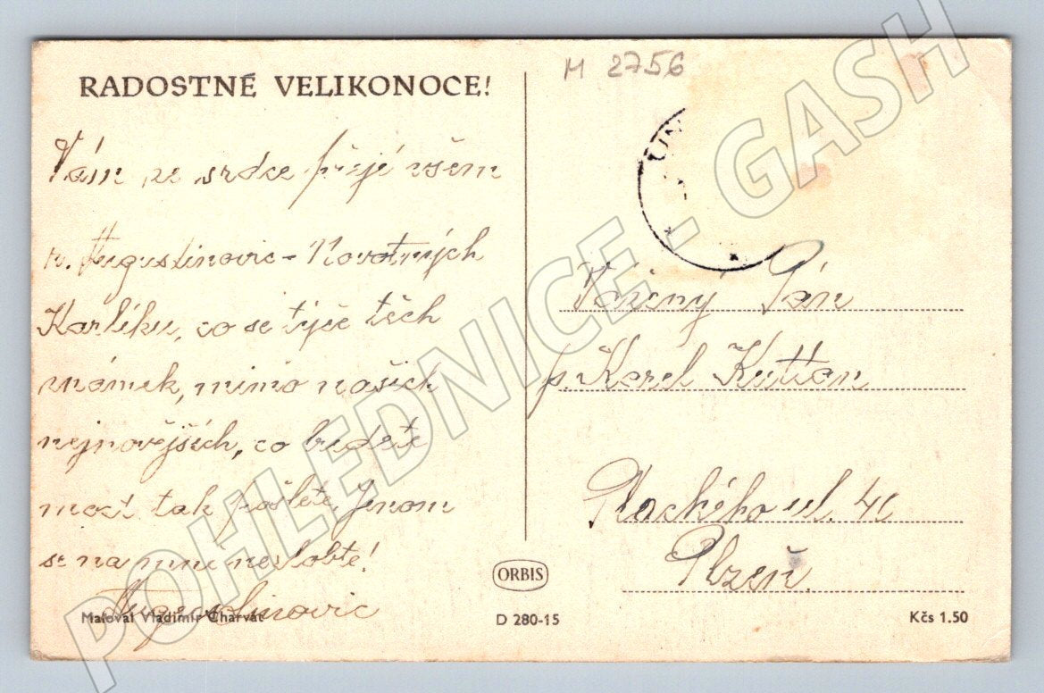 I am offering for sale a vintage postcard with a tractor in a field motif. The postcard is hand-painted by Vladimír Charvátovič and depicts a rural scene with a tractor and an agricultural harvester in the foreground, with other workers in the field and a landscape with a hill in the background. An Easter greeting is attached on the back and addressed to Mr. Karel Kittan in Pilsen. The postcard is older, in good condition with slight wear to the edges, suitable for collectors of old transport postcards and lovers of agricultural history. The postcard comes from the publisher ORBIS and offers an authentic view of agricultural machinery from past decades. The price is in Czechoslovak crowns (Kčs 1.50).