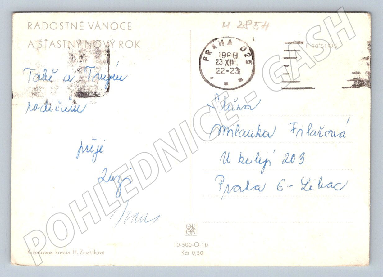 This original Christmas postcard dates from before 1950 and features a witty and colorful drawing by H. Zmatlíková. The front side depicts a bottle with the inscription Merry Christmas and a humorous figure of Santa Claus with a hat. The postcard is addressed and postmarked, giving it an authentic touch of Christmas cards from years past. The back side is printed with greetings and wishes for a Merry Christmas and a Happy New Year. A perfect collector's item for lovers of Czech Christmas iconography and postcard collecting.