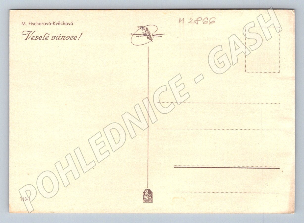 Postcard with a Christmas motif by M. Fischerová-Kvěchová, depicting angels around a Christmas tree. The illustration is in soft tones and carries the traditional Christmas mood. The postcard is in good condition, without damage, suitable for collectors and lovers of Christmas cards. On the reverse side is printed the text Merry Christmas! and space for the address and stamp. The size of the postcard corresponds to the standard format. This is a beautiful piece of Christmas folk culture and art. Ideal for sending wishes or for adding to your collection of Christmas cards.