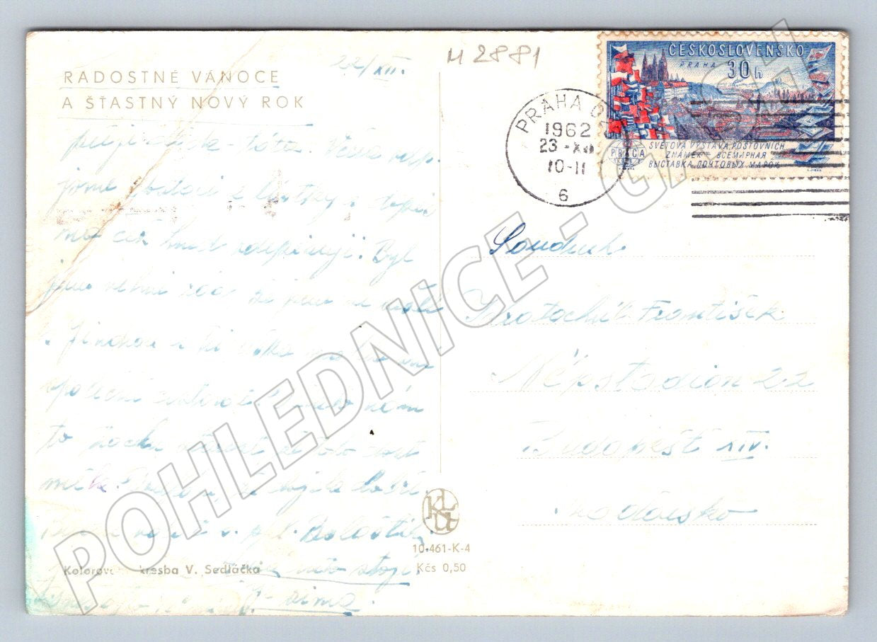 I am offering an interesting older postcard with the author's colored drawing by V. Sedláček from 1961. The picture shows a winter rural scene with a drawn sleigh, a horse and two figures in the background. The postcard is stamped with a 1962 Prague stamp and a Czechoslovakian stamp with the motif of the World Stamp Exhibition. Suitable for collectors of old domestic postcards and lovers of winter nostalgia. The condition corresponds to its age, clear signs of use on the reverse, otherwise in good condition.