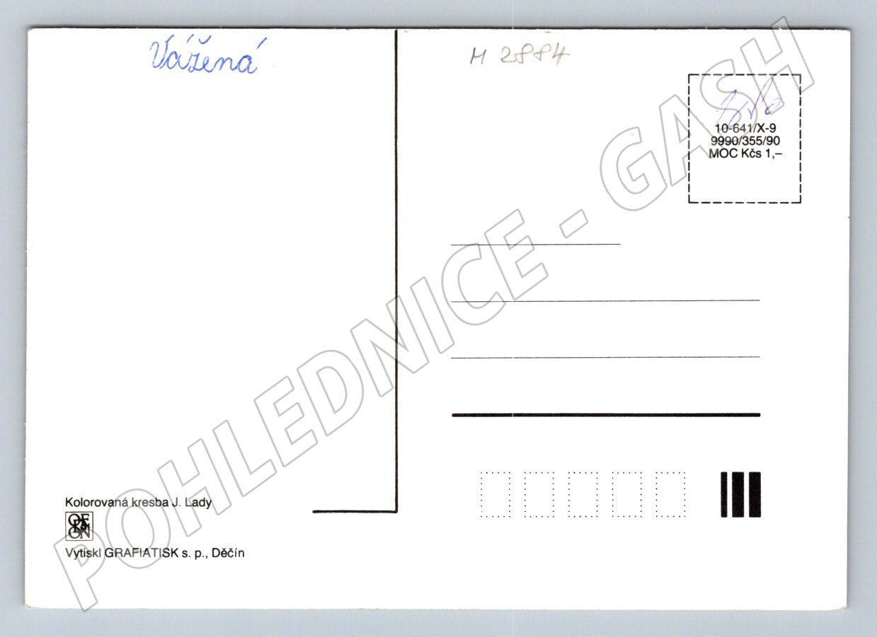 I am offering for sale a colorful postcard with a winter landscape motif based on a drawing by the famous Czech painter Josef Lada from 1955. The postcard depicts a snowy village with a red hen on a tree under a night sky with falling snow. The windows of the houses are illuminated, which gives the postcard a cozy atmosphere. The back side has a printing mark and information about the publisher (GRAFIATISK sp, Děčín). The postcard is in good condition, suitable for both collectors of Lada's graphics and lovers of Czech folk culture and winter motifs. Standard size, suitable for sending and displaying in a collection.