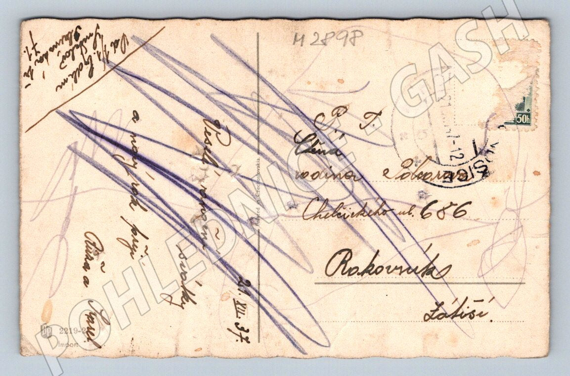 I am offering an old Christmas postcard with a motif of a winter landscape, snowy spruces, and two deer in the foreground. In the background, three cottages and a snow-covered starry sky are visible. On the front side is the text Merry Christmas in stylized font. The postcard is provided with a postage stamp and a stamp, the back side contains handwritten text and an address, which indicates its authenticity and age. The postcard has signs of wear and traces of writing, which only underlines its historical value. Ideal for collector's purposes or for Christmas decoration with a retro touch.