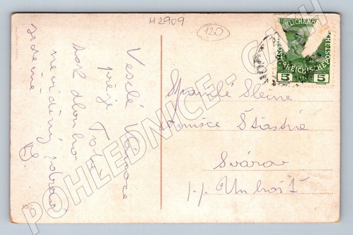 I am offering an old postcard depicting a young couple in love in an elegant interior. The postcard is colorful, hand-colored, with a motif of a woman in a pink dress and a man in a suit. On the back there is a written message in old Czech and a stamp with a postmark. The postcard is in good condition with minor signs of age on the edges. A great collector's item for lovers of vintage and romantic motifs.