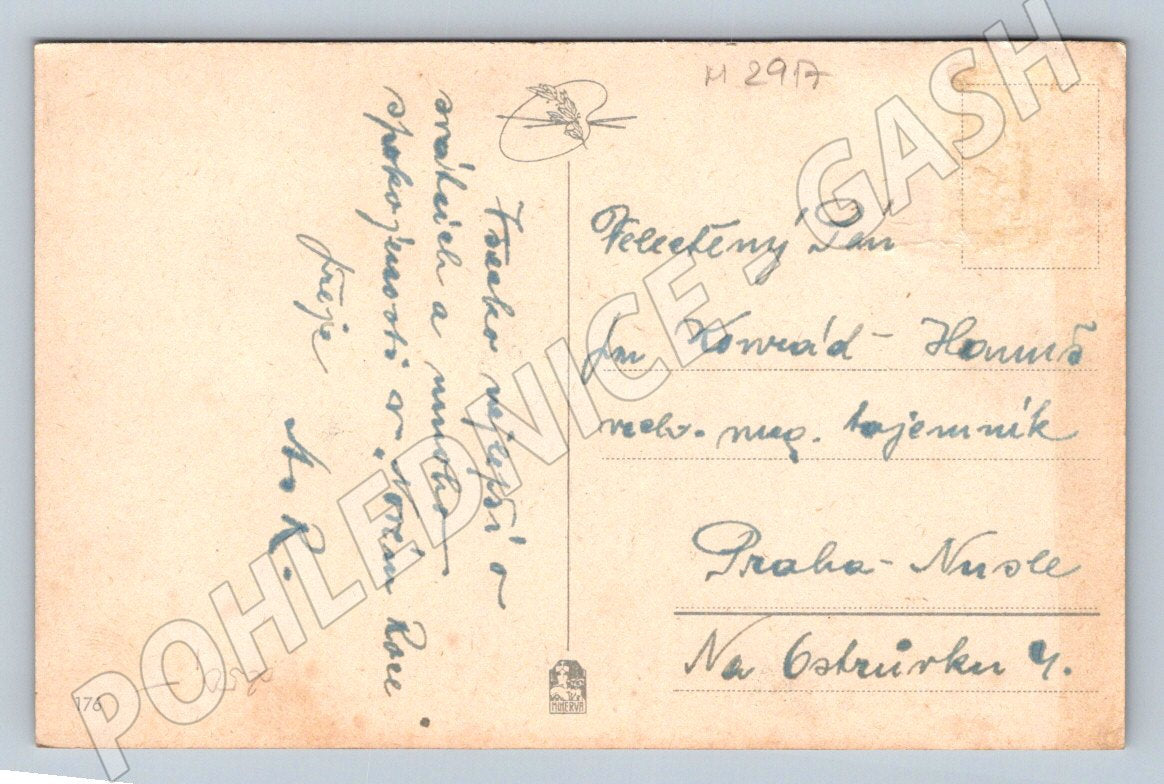 An older black and white postcard is titled Pleasant Mild Evenings. The front side depicts a man with a hat and a cane standing in front of an ornate arcade that frames the view of the classicist architecture in the background. The postcard has written text and an address on the reverse side, which proves its authentic use. The period style and preserved condition make this postcard an interesting collector's item suitable for collectors of historical postcards and monuments.