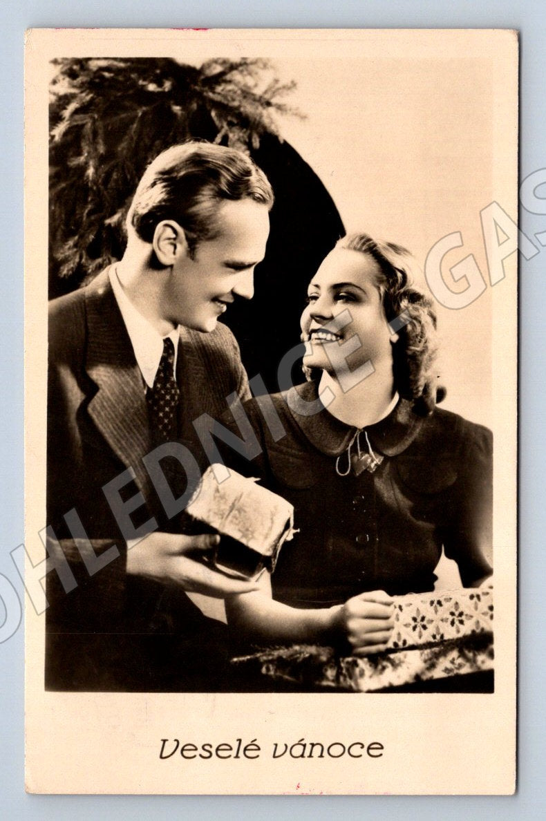 This old postcard depicts a Christmas motif with two smiling young people exchanging gifts. The postcard is inscribed Merry Christmas and is handwritten, with a Czechoslovakian postage stamp. On the back is a handwritten wish, which gives the postcard an authentic and historical touch. An ideal collector's item for lovers of Christmas postcards and historical documents from the field of ethnography and traditions.