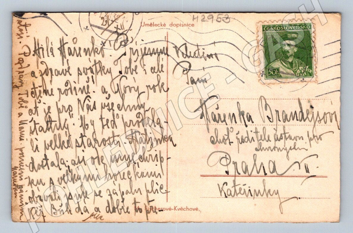 I am offering an interesting old postcard with an illustration of a small child in a red dress holding a bouquet of flowers and knocking on a door with a keyhole. The postcard is written and stamped, it comes from the Czechoslovakian period, which is also evidenced by the present stamp with a portrait. On the back there is a handwritten message and a partially printed inscription Heartfelt Congratulations. The postcard is in good condition with visible signs of age, suitable for postcard collectors or lovers of old postcards and ethnographic motifs. Ideal as a collector's item or a gift with historical value.