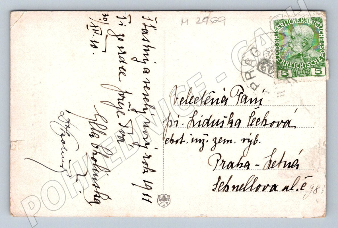 An antique Christmas postcard titled Merry New Year depicts a traditional folk custom and clothing from ancient times. The image shows a group of figures in folk costumes holding lanterns and walking in the evening winter light, evoking the old customs of welcoming the New Year in the Czech countryside. The postcard is provided with a postage stamp and a handwritten message addressed to Prague, making it an interesting historical artifact. The postcard is in good condition for its age, with visible signs of wear and tear and the paper is well-preserved. Ideal for collectors of folklore, ethnographic and old postcards.