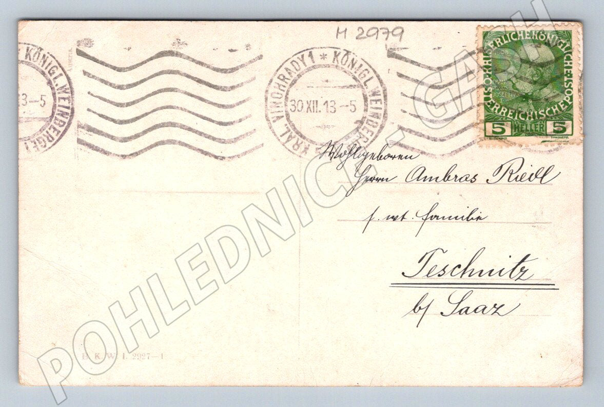 A rare old postcard with a beautiful Christmas illustration depicting children building a snowman, a child with a sprig of mistletoe. The postcard has preserved handwriting and a stamp from 1913, which makes it an interesting collector's item from the first half of the 20th century. On the front side is the inscription Glückliches Neujahr (Happy New Year) in German. The stamp and postage stamp reflect the historical period of Austria-Hungary, which adds historical value to the postcard. Overall condition is good with minor signs of age and wear, suitable for collectors of old Christmas postcards and lovers of the history of postal artifacts.