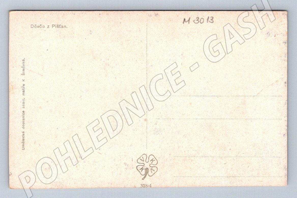 Older postcard with a motif of a girl from Píšťany in a traditional folk costume. The postcard has an artistic touch and was probably painted by the academic painter K. Šimůnek. The postcard is in good condition with a patina of age, without significant damage. An ideal collector's item for lovers of Czech folk culture and ethnography.