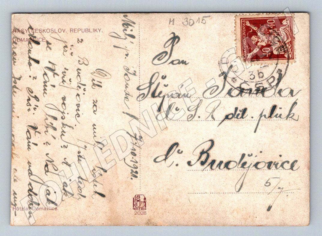 An older postcard depicting a scene from the town of Domažlice, captured through the arches of historical architecture. The postcard shows people in traditional costumes, which documents the ethnographic value of this postcard. The painting acts as a detailed and colorful record of folk culture and architecture. The postcard is provided with a postage stamp and handwritten text, which adds authenticity and historical context. A quality collector's item for lovers of Czech culture and traditions, especially ethnographic motifs from the Chodsko region.