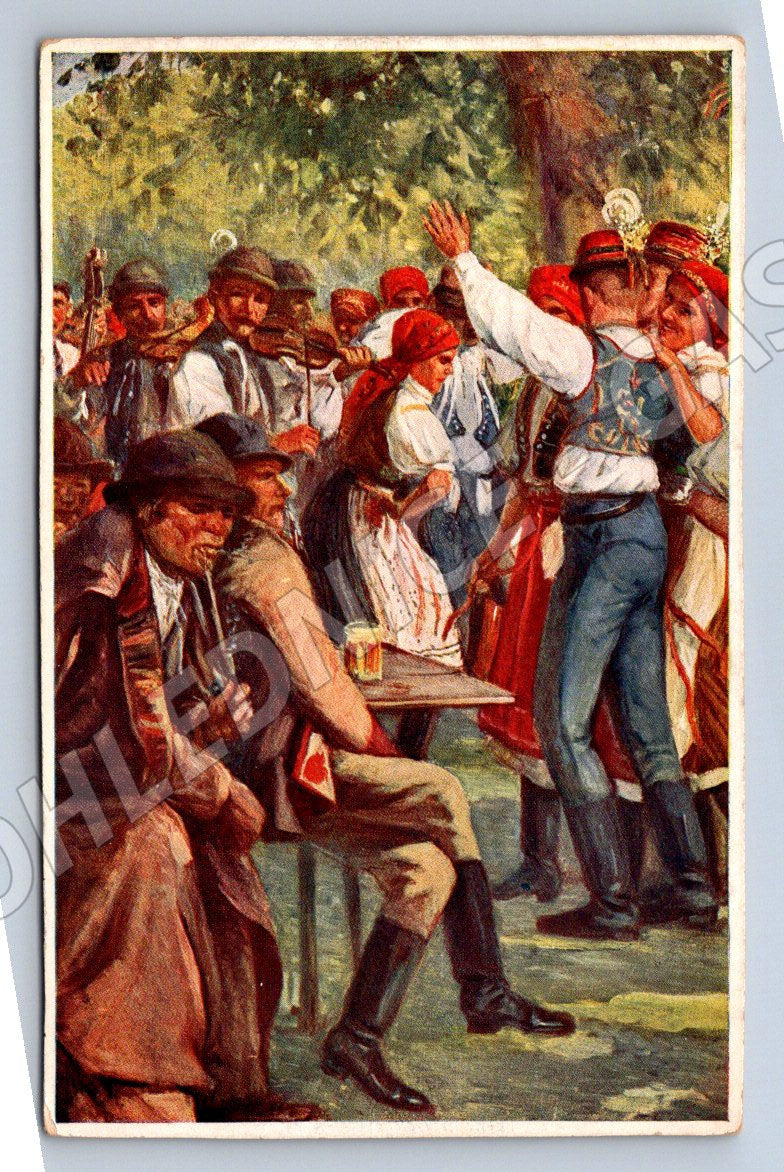 I am offering an old art postcard titled During Music by academic painter Jóža Koudelka. The postcard depicts folk musicians and dancers in traditional costumes at a musical gathering outdoors. The painting is rich in colorful details and authentic examples of costumes that depict Czech folk culture. The postcard is in good condition, suitable for collectors of folk culture, ethnography and art postcards. The back is blank, the postcard is unwritten and intact. The dimensions correspond to the classic postcard format.