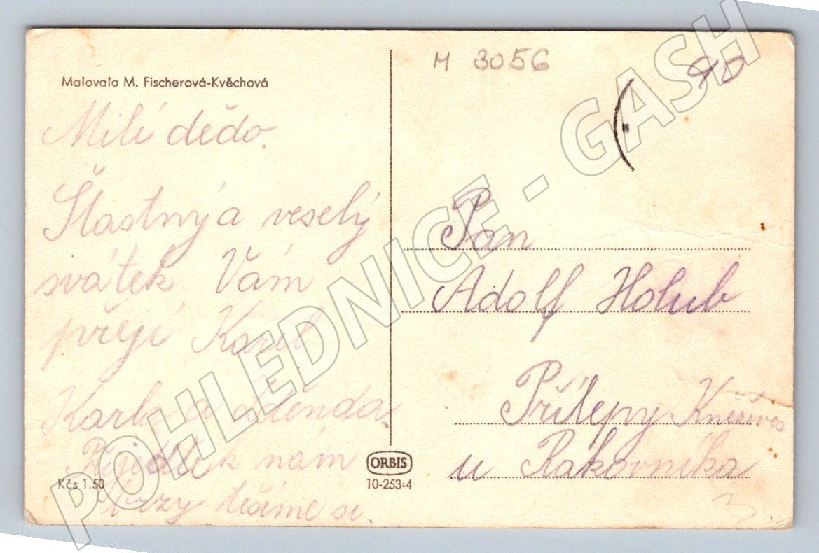 I am offering an old postcard from the production of Malovala M. Fischerová-Kvěchová, depicting a woman in a traditional costume with a child on her back, a beautiful example of Czech ethnography. The postcard bears the inscription SRDÉČNÉ PŘÁNÍ and on the back there is a handwritten message addressed to Mr. Adolf Holub. The postcard is slightly faded and the age is noticeable, which adds to its charm and authenticity. Suitable for collectors of ethnographic and historical postcards, as well as for lovers of folk culture.