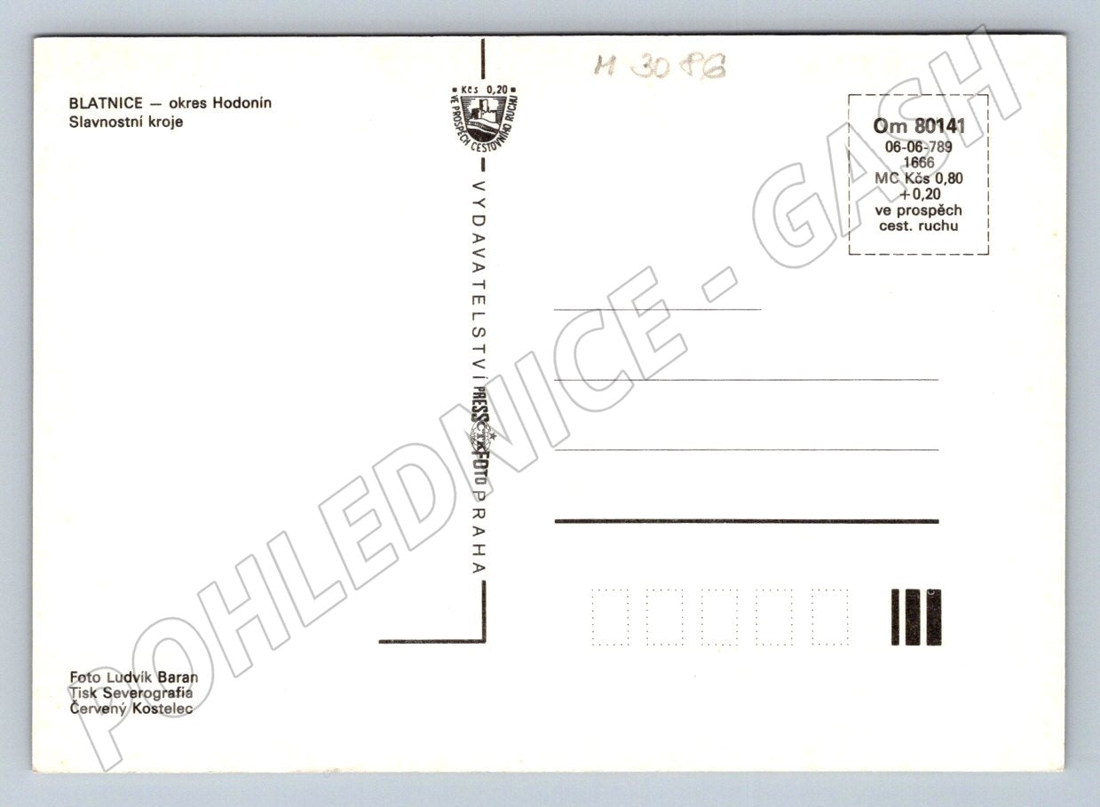 The postcard depicts a group of people dressed in festive costumes from Blatnice, Hodonín district. The picture shows men, women and children in brightly colored traditional costumes with rich lace and hats. The photograph dates from around the 1980s and captures local folklore and traditions. The postcard is in good condition, suitable for postcard collectors, ethnographers and lovers of Moravian culture.