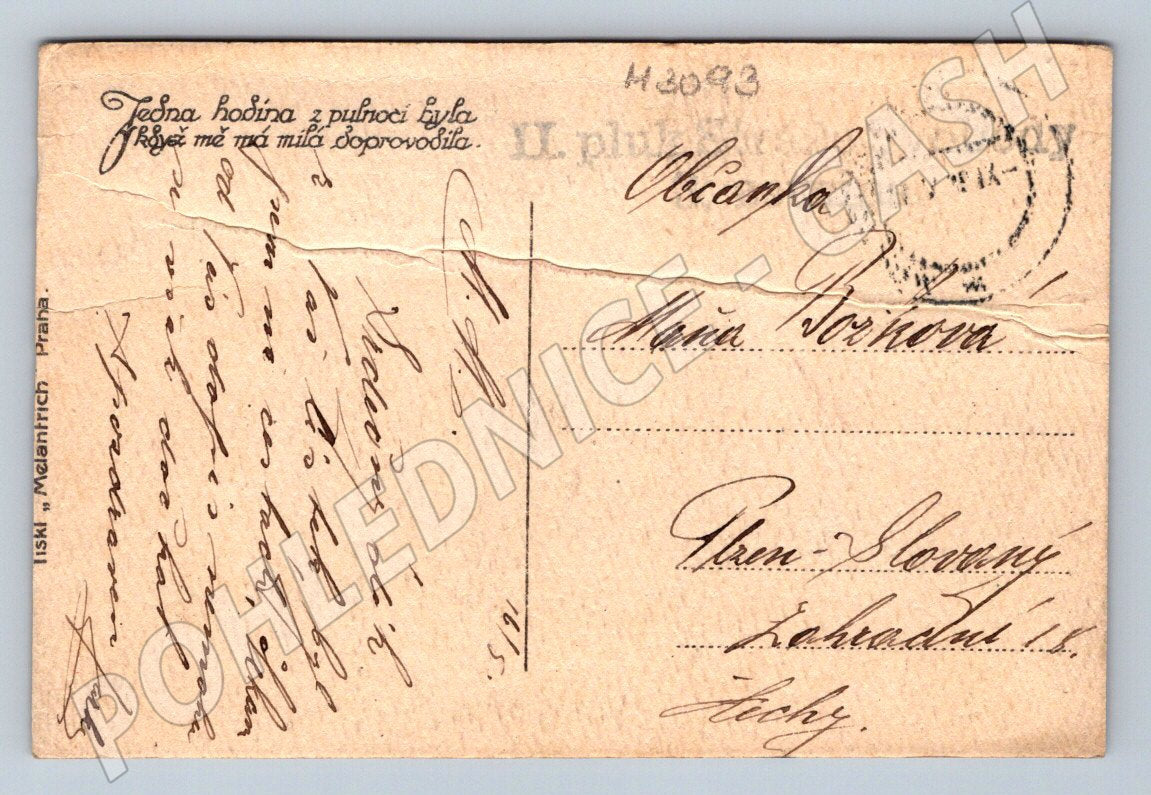 I am offering for sale an original postcard depicting a loving couple in traditional folk costume under a night sky with a moon. The postcard bears distinctive folklore and ethnographic elements, is very interesting in color and elaborated in detail. On the back there is a handwritten address and dedication, which gives the postcard authenticity and historical value. The postcard is in good condition with visible signs of use and age, visible light bends and fading, but without serious damage. An ideal collector's item for lovers of Czech folk culture and old postcards. The size corresponds to the classic format of postcards from the beginning of the 20th century. II REGIMENT MILITARY STAMP