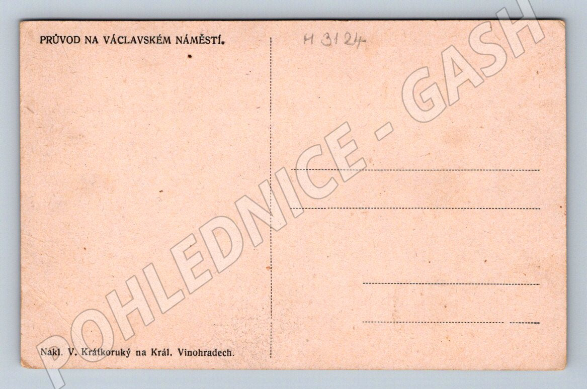 Historical black and white postcard depicting a procession on Wenceslas Square in Prague. The photograph shows a military procession with soldiers in uniform and a hearse with a coffin decorated with flowers. In the background, period shop signs are visible, including an inscription on furniture. The postcard is an authentic document of an important event and offers an interesting insight into the history of the Czech metropolis. On the back of the postcard is the text PROCESSION ON WENCLAWS SQUARE and information about the publisher V. Krátkoruký on Král. Vinohrady. The postcard is in good condition with slight signs of age.