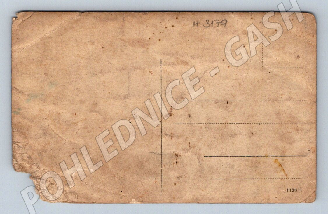 This old sepia postcard depicts a group of men in folk costumes, probably a municipal music band, in front of a historic building. The men are holding various musical instruments such as trumpets, drums, trombone and French horn, suggesting that this is a traditional musical ensemble. The postcard has signs of age and wear, which increases its historical value for collectors. There are no written notes on the back of the postcard, which allows for its further use. A very interesting and authentic specimen documenting the folklore and musical traditions of our territory.