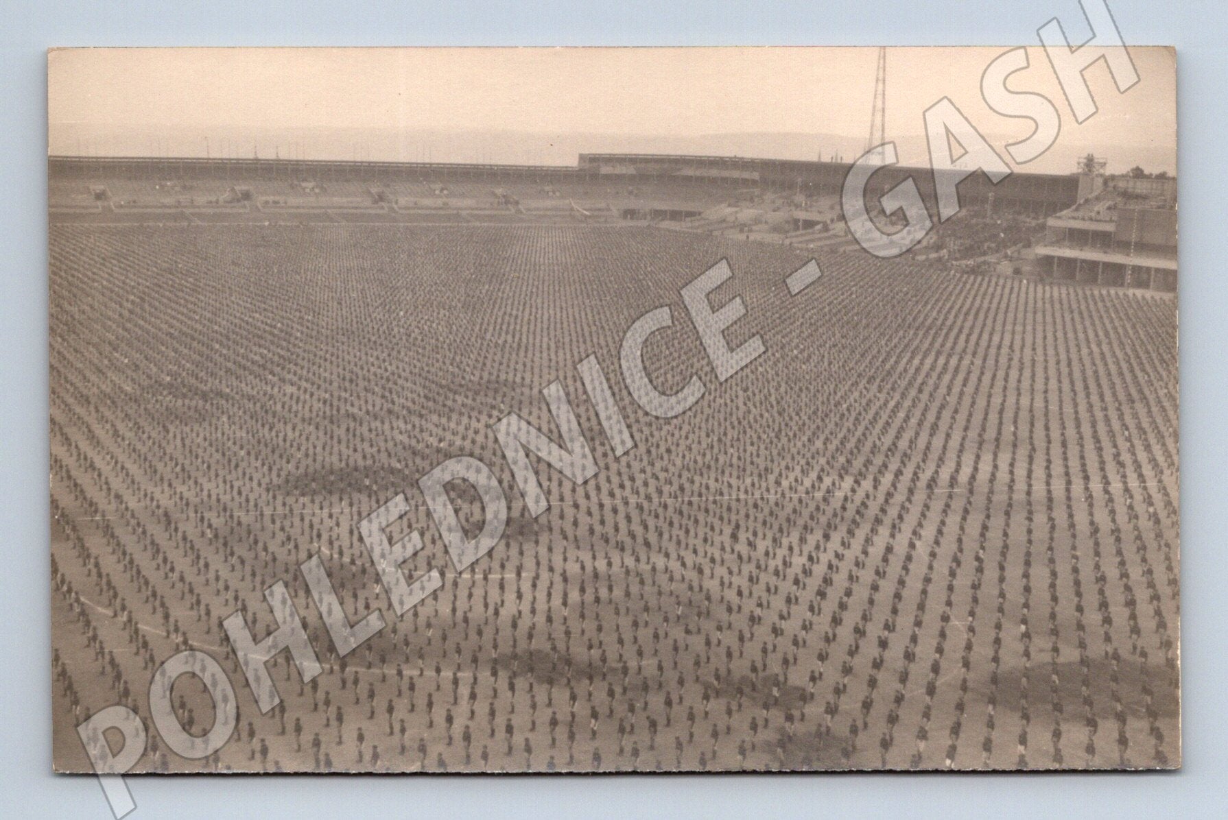 Nabízím starou černobílou pohlednici s motivem rozsáhlého vojenského či společenského shromáždění na stadionu. Pohlednice je bez popisu a jasného určení místa nebo státu, ale na snímku je vidět velké množství lidí seřazených v perfektních řadách. Typická atmosféra slavnostní přehlídky či manifestace. Zadní strana je nepopsaná, v horní části ručně psaný nápis a značení. Vhodné pro sběratele historických pohlednic či zájemce o vojenské a společenské události.