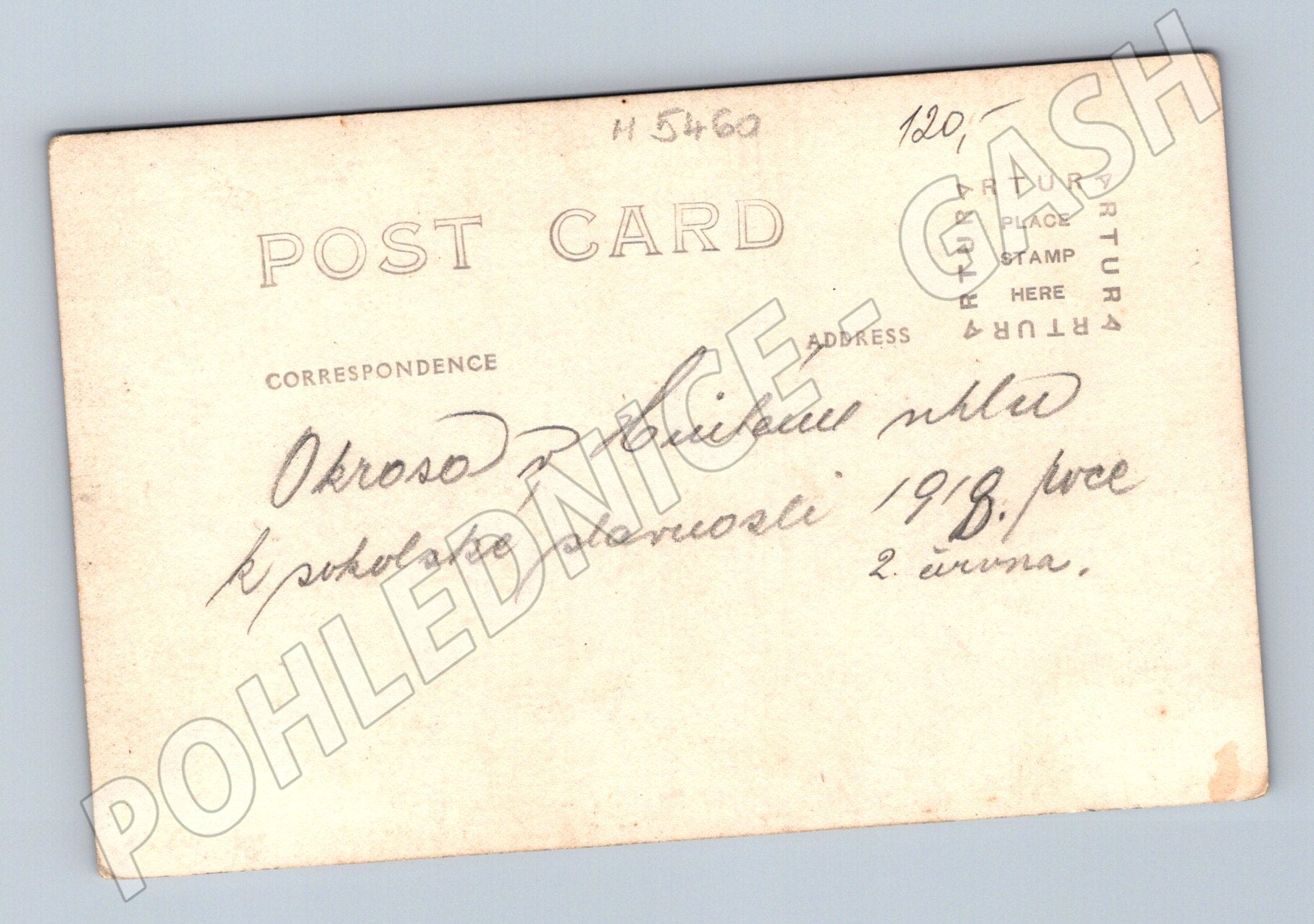 Historická pohlednice z období první světové války. Na přední straně je zobrazen park s květinovým záhonem, kolem kterého postávají vojáci a lidé v uniformách, v pozadí venkovská krajina a budovy. Ručně psaná poznámka na zadní straně: Okroso, pohlednice průvodci 1918, 2. června . Pohlednice je v černobílém provedení typickém pro začátek 20. století. Stav viz foto, vhodné pro sběratele historických pohlednic z České republiky.