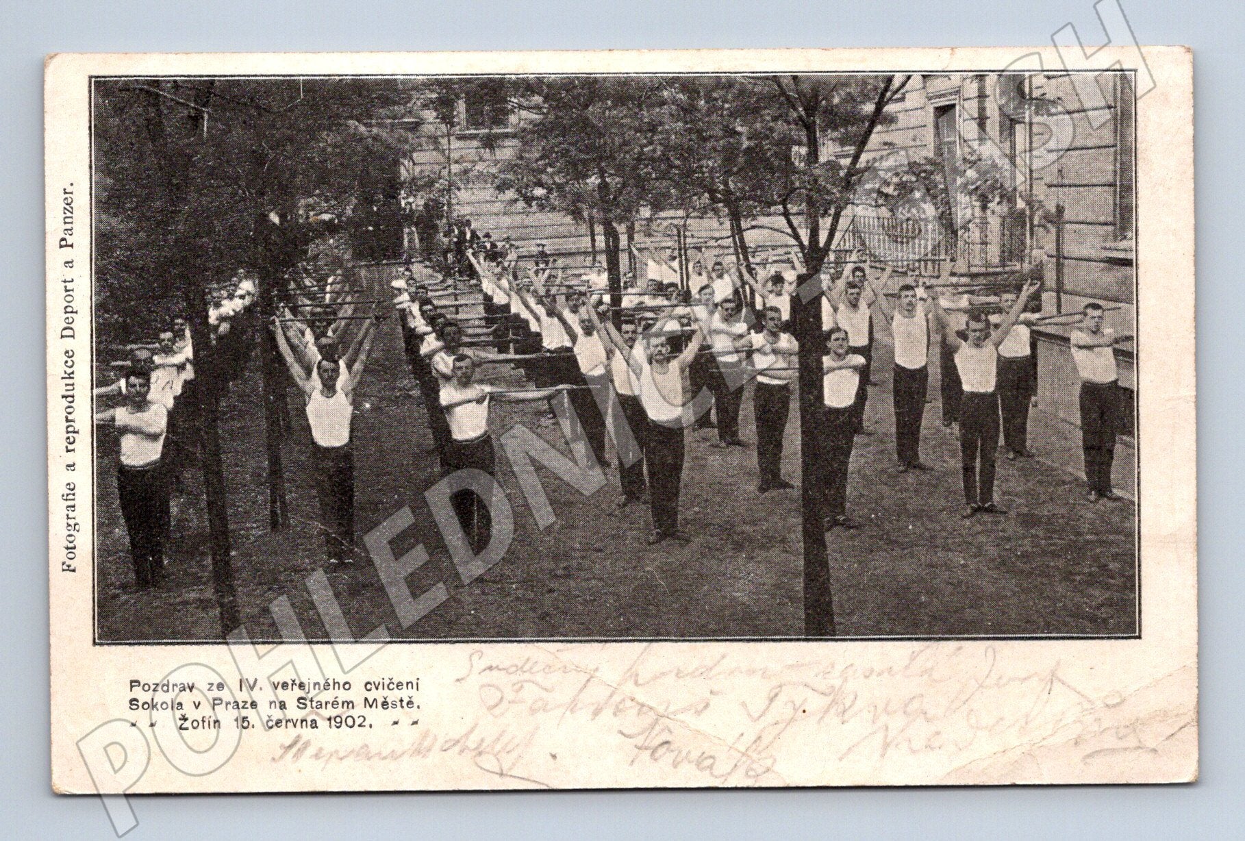Starý pohled z veřejného cvičení Sokola v Praze na Starém Městě, konaného na Žofíně dne 15. června 1902. Pohlednice zachycuje řady cvičenců v typických sokolských úborech během slavnostního vystoupení na dvoře před historickou budovou. Na zadní straně razítko a dobová známka 5 heller, adresováno slečně ve Zlonicích. Ve velmi dobrém sběratelském stavu, menší opotřebení odpovídající stáří (převážně rohy, drobné zašpinění).