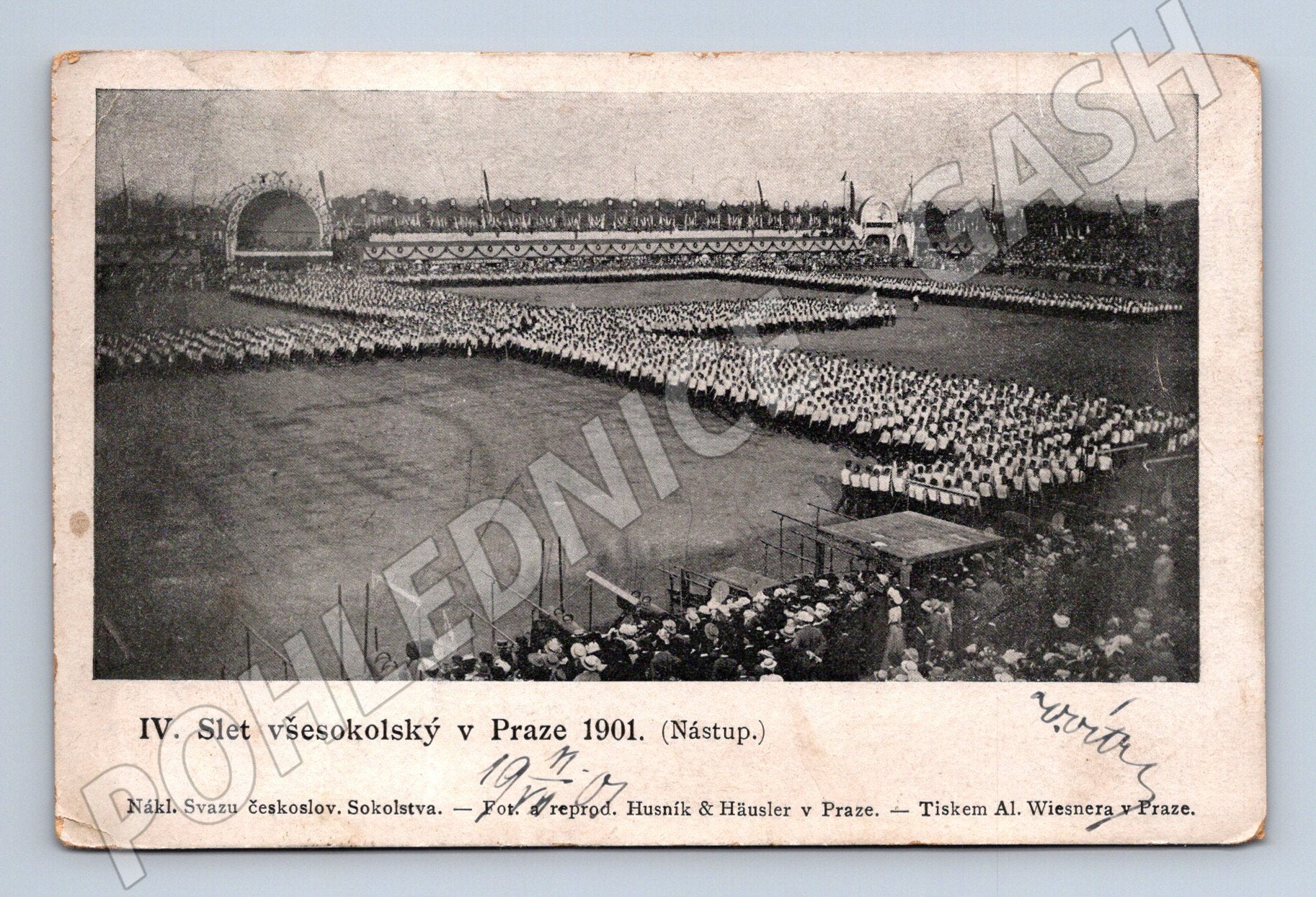 Originální historická pohlednice zobrazující IV. všesokolský slet v Praze v roce 1901 – slavnostní nástup. Černobílý snímek zachycuje monumentální shromáždění členů Sokola na stadionu za přítomnosti velkého davu diváků. Na dolním okraji je uveden název akce a vydavatel: Svaz českoslovanského Sokolstva, fotografie a reprodukce Husník & Häusler v Praze. Zadní strana je popsaná, razítkovaná a doplněná dobovou známkou, použito v poštovním provozu roku 1901. Pohlednice je cenným dokladem české historie, sběratelsky zajímavá, s patrnými stopami stáří a běžným opotřebením odpovídajícím věku.
