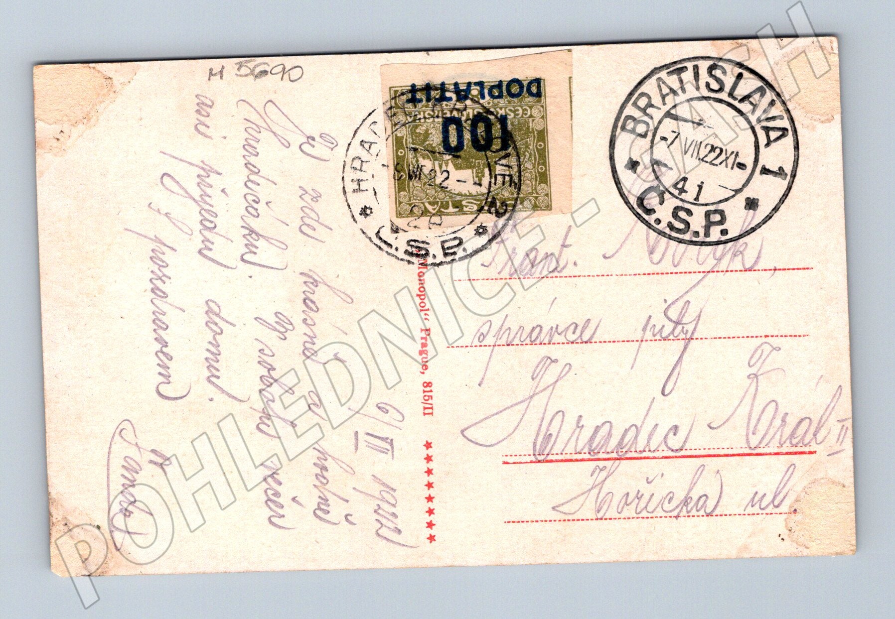 Original historical postcard depicting the steamship Luitpold on the Danube River and the iconic Devín Castle in the background. The postcard is colored, shows signs of age and was sent in 1922 from Bratislava, as evidenced by the period postage stamp and postmark. This is a beautiful collector's item associated with water transport and an important monument in Slovakia. Condition see photo - minor signs of wear, patina, back side described. STAMP! 1922, Hradčany 100/80h, overprint