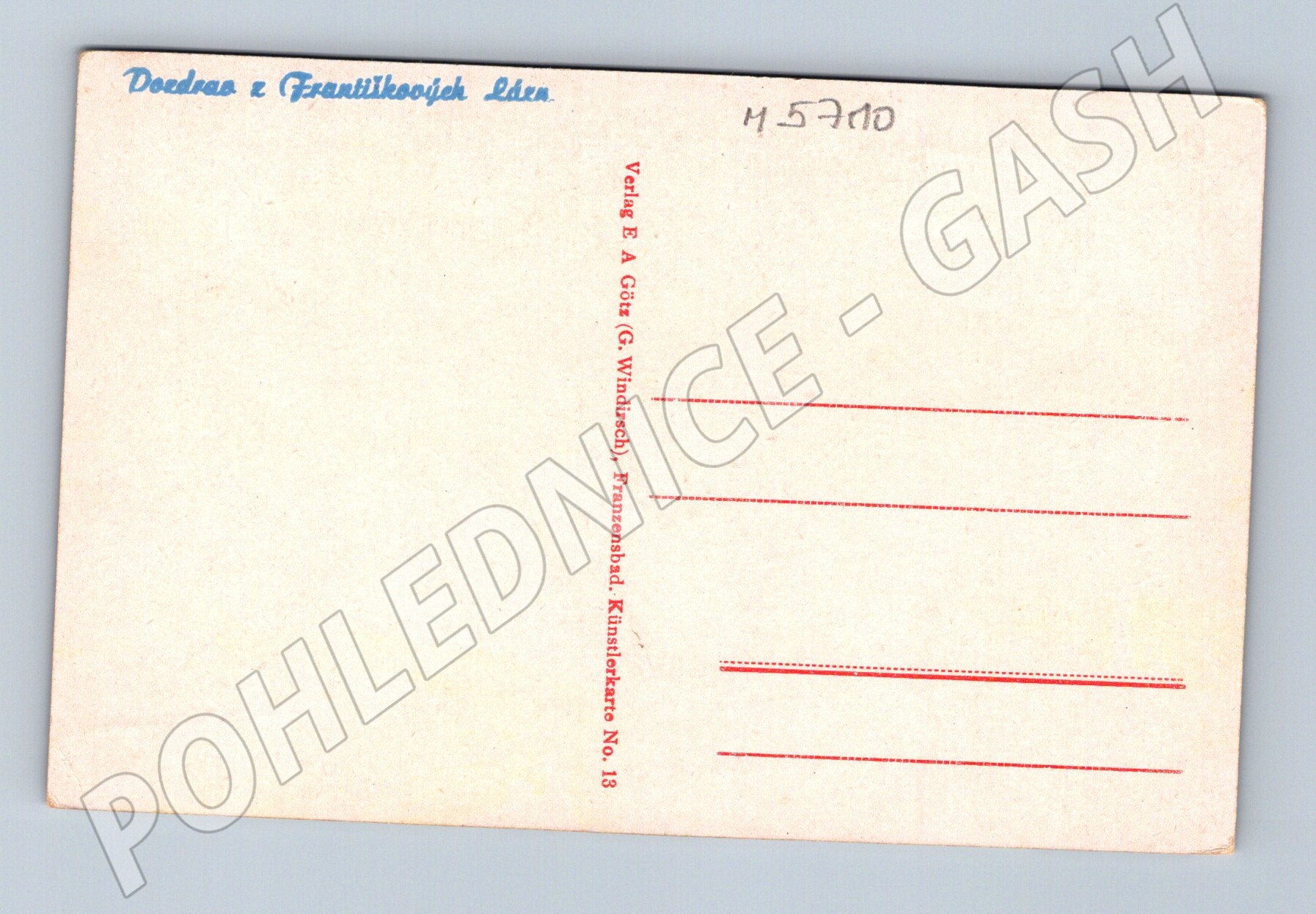 Original historical postcard with a colorful motif of the promenade in the spa park of Františkovy Lázně. The postcard depicts a busy spa colonnade with many people in period clothing, flower beds and a gazebo. On the back is the inscription Doedraa z Frantílkovy Lázně and the publisher Verlag E. Götz (G. Windirsch), Franzensbad. The catalog number of the postcard is No. 13. The postcard is in good collector's condition, without description and without a stamp. Suitable for collectors of postcards from the first half of the 20th century and those interested in historical spas in Bohemia.