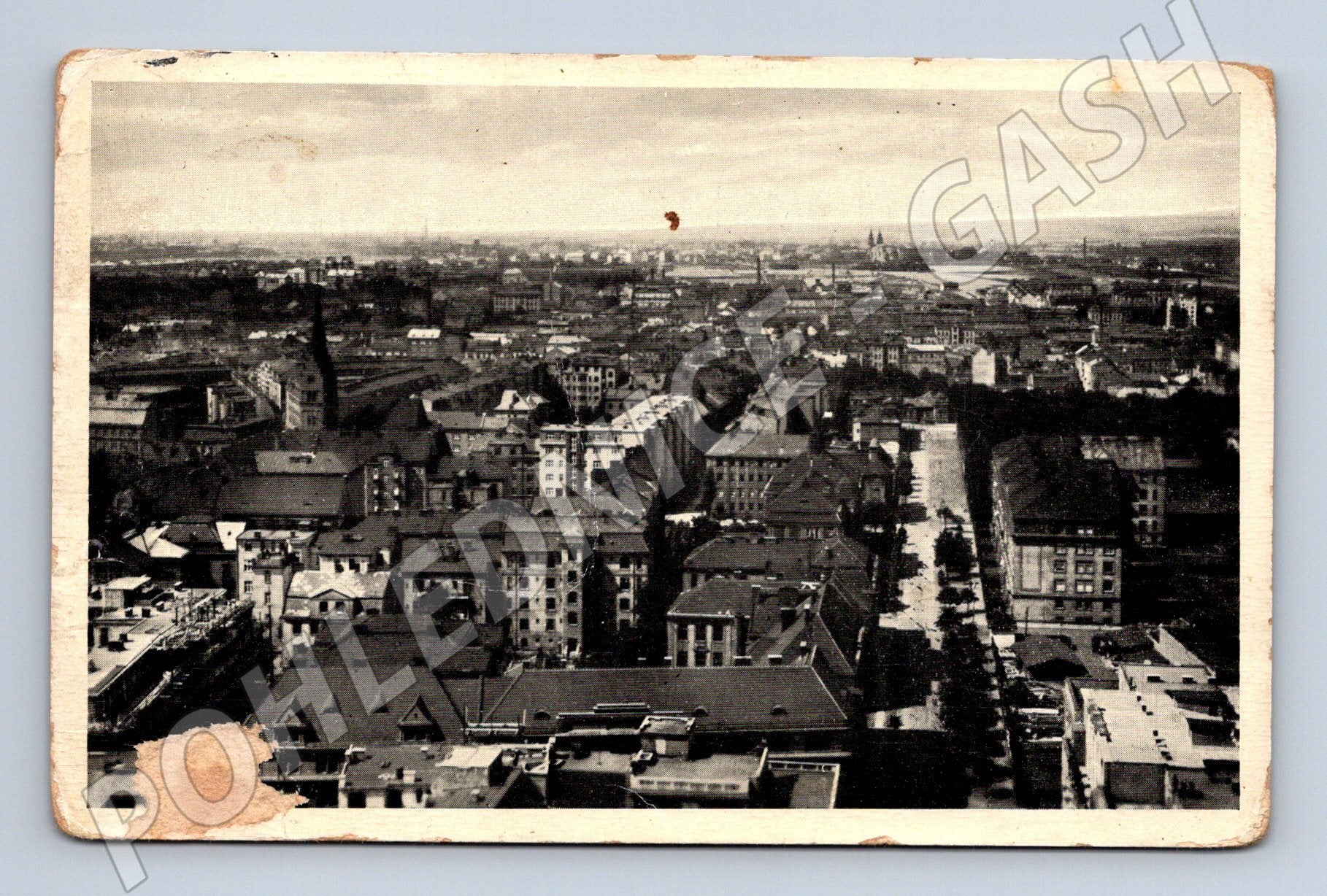 Older black and white postcard titled MOR. OSTRAVA. The overall view captures a historical panoramic view of the city of Ostrava. The postcard is in a small format and was issued before 1950, which demonstrates the use of a classic divided reverse side for the address and message. The postcard shows the architecture of the time, industrial buildings and the wider city center with adjacent streets. On the front side there is a clear loss of paper in the lower left corner (damage), the reverse side is clean, with only traces of age and handwritten notes. Ideal for adding to a collection of historical postcards of Ostrava or the Czech Republic.