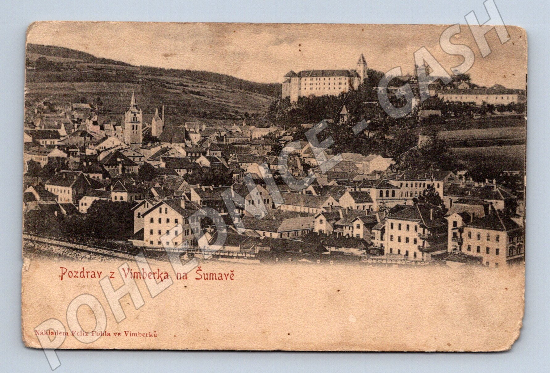 Original old postcard with a motif of Vimperk in the Bohemian Forest. The postcard offers a beautiful panoramic view of the town with the dominant castle and historical buildings. It bears the inscription Greetings from Vimberk in the Bohemian Forest and is marked as a correspondence card on the reverse. Edition: Felix Pohl in Vimberk. The postcard is in condition consistent with its age (patina, minor abrasions and bends in the corners). A great collector's item from the period before 1950.