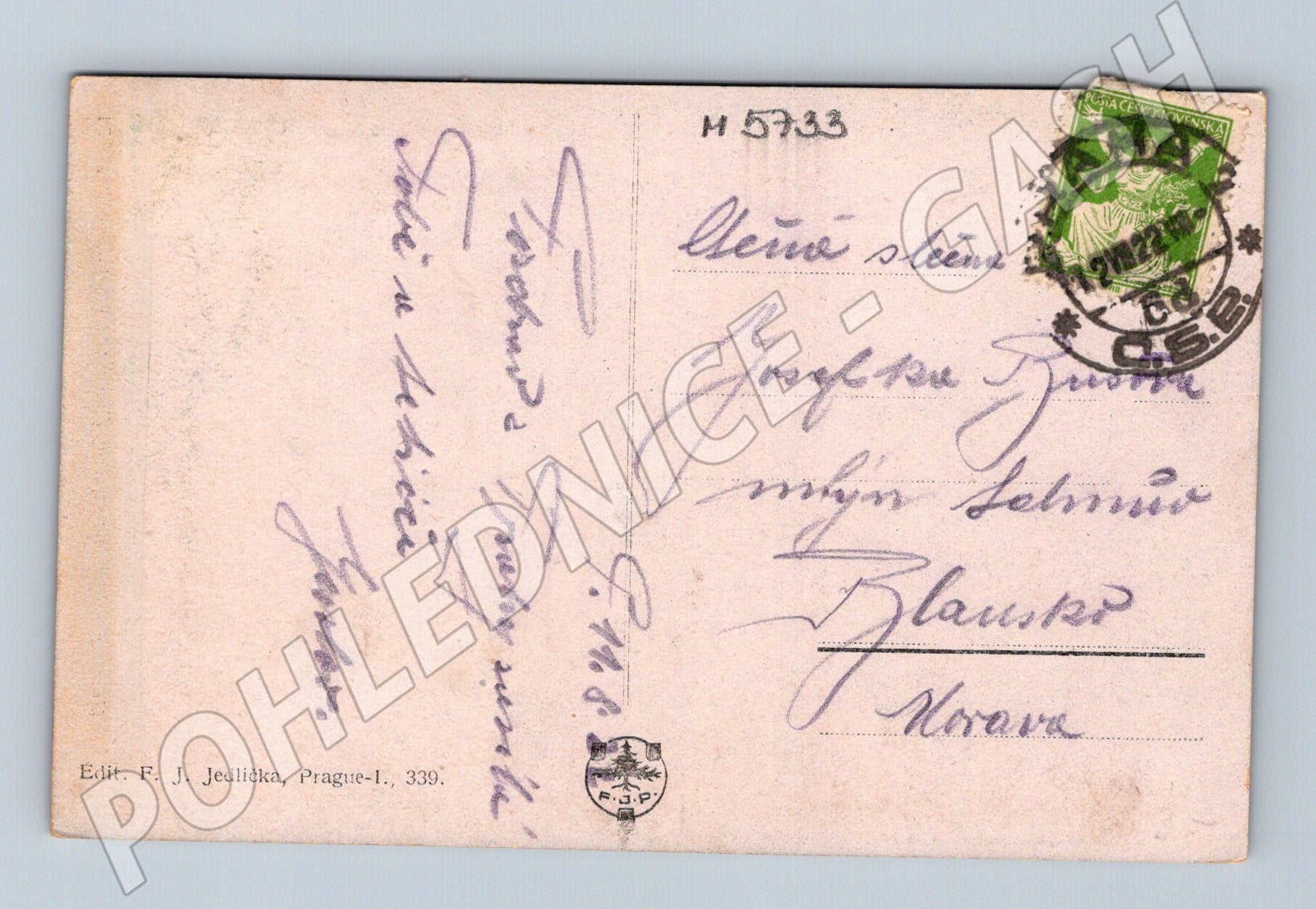 Original old postcard with a beautiful view of Prague, specifically the Charles Bridge and Hradčany. The artistic drawing captures the Prague panorama from the perspective of the Lesser Town, in the foreground is the Charles Bridge with pedestrians and carriages, in the background are the unmistakable landmarks of Hradčany and the Old Town. The postcard has been sent, on the reverse there is a handwritten text, a stamp and a postmark. Publisher: FJ Jedlička, Prague. The condition corresponds to its age, see photo. Ideal for collectors of historical postcards of Prague and lovers of Czech history.