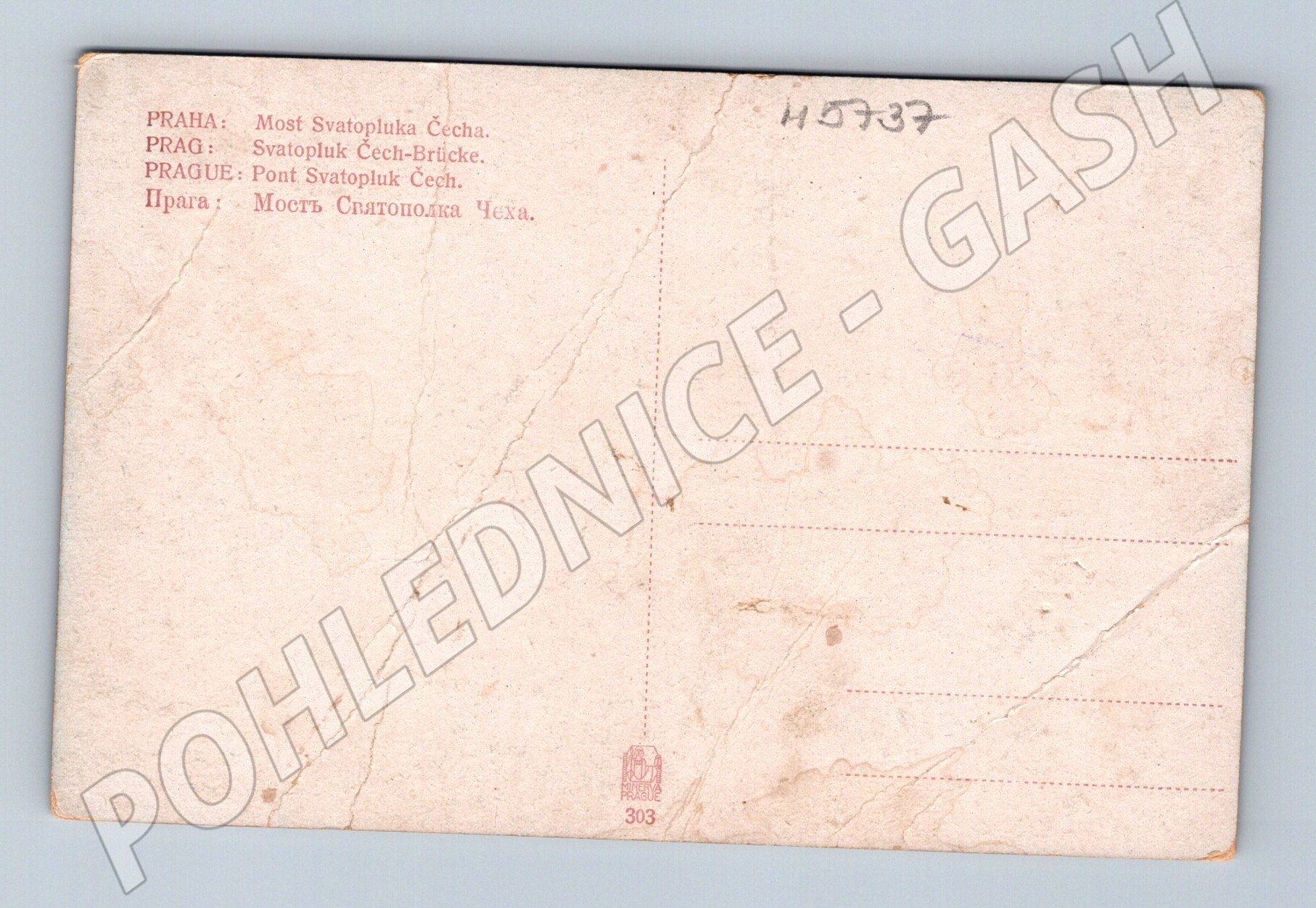 Historical postcard depicting Svatopluk Bridge in Prague with a passing tram. The colorful postcard dates from the first half of the 20th century. On the front side, the bridge with typical statues, a tram and a panorama of Prague houses are clearly visible. The back side contains a description of the bridge in several languages (Czech, German, French, Russian). The postcard is in good collector's condition, with minor signs of age and wear in the corners and edges, without interfering with the main motif. Suitable for lovers of old Prague, transport and historical postcards.