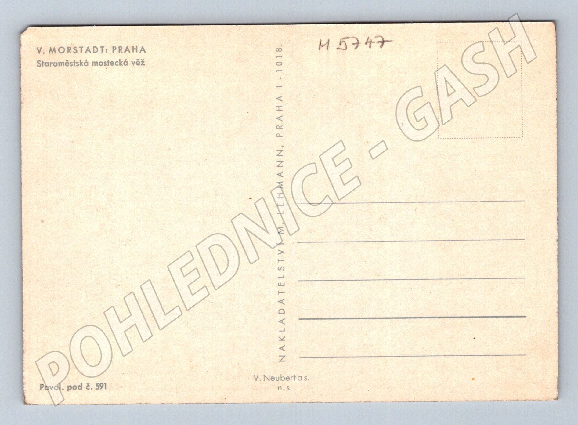 Old postcard V. Morstadt: Prague - Old Town Bridge Tower. Beautiful period drawing with a detailed depiction of the famous Gothic tower at the entrance to Charles Bridge in Prague. The postcard is unworn, in nice collector's condition, without description or damage. On the back is the publisher Nakladatelství M. Lehmann, Prague and the permit number 591. Suitable for lovers of historical Prague, architecture and collectors of old postcards.